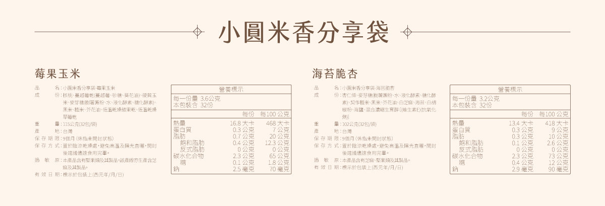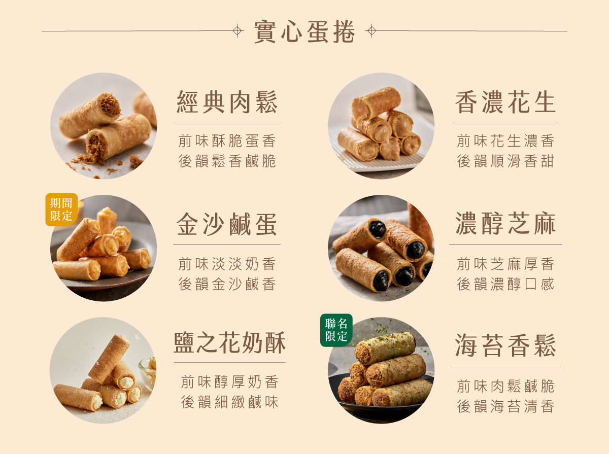 ・規格:實心蛋捲x2+粹蛋捲x1+米香分享袋x1+品牌大提袋