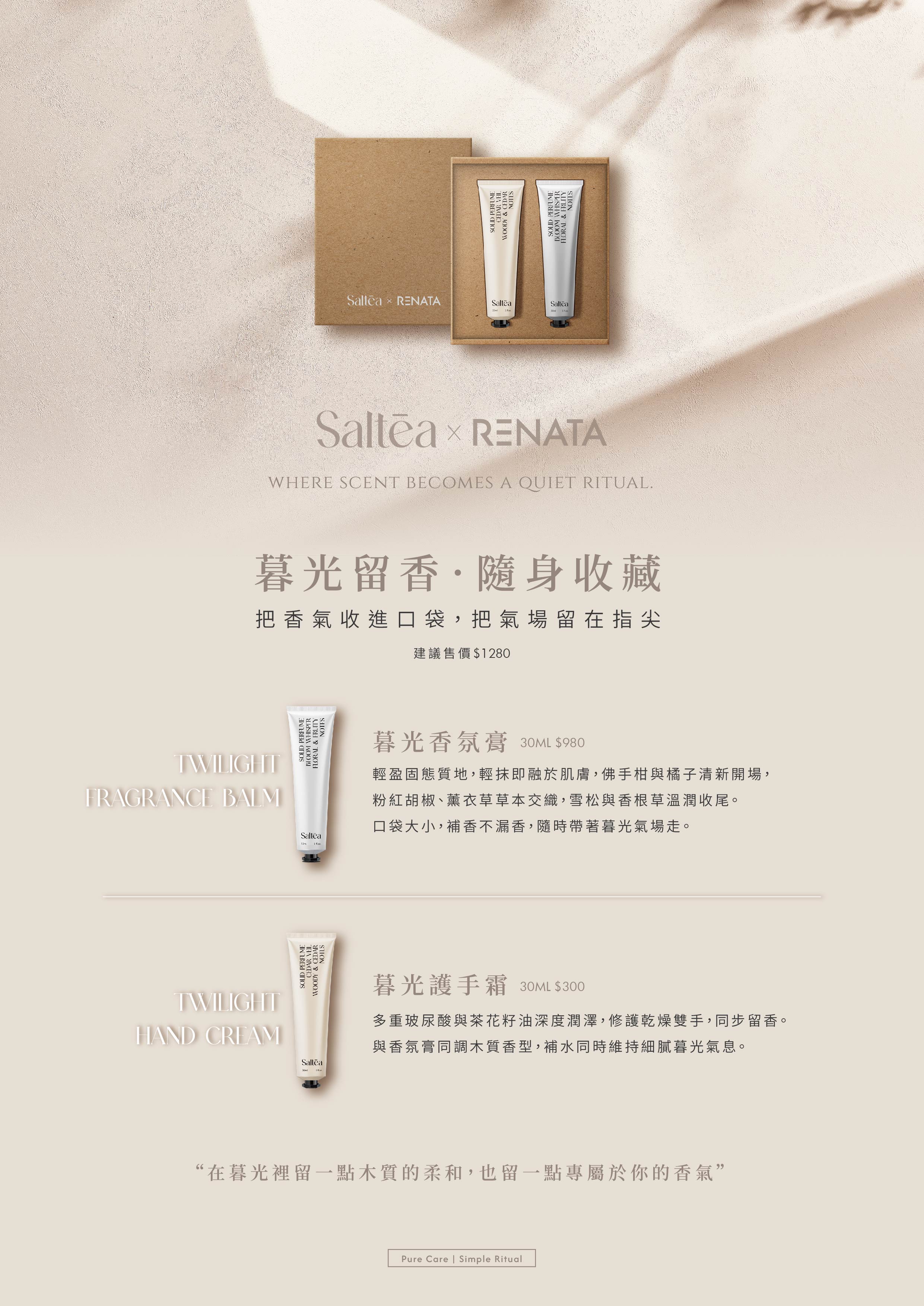 Renata 靜謐手香禮盒以細膩香氛結合護手滋養,打造沉靜放鬆的香氣時光內含高保濕護手霜與手香膏,質地輕盈不黏膩,瞬間吸收、柔潤雙手搭配高雅包裝設計,送禮自用都展現品味與溫度