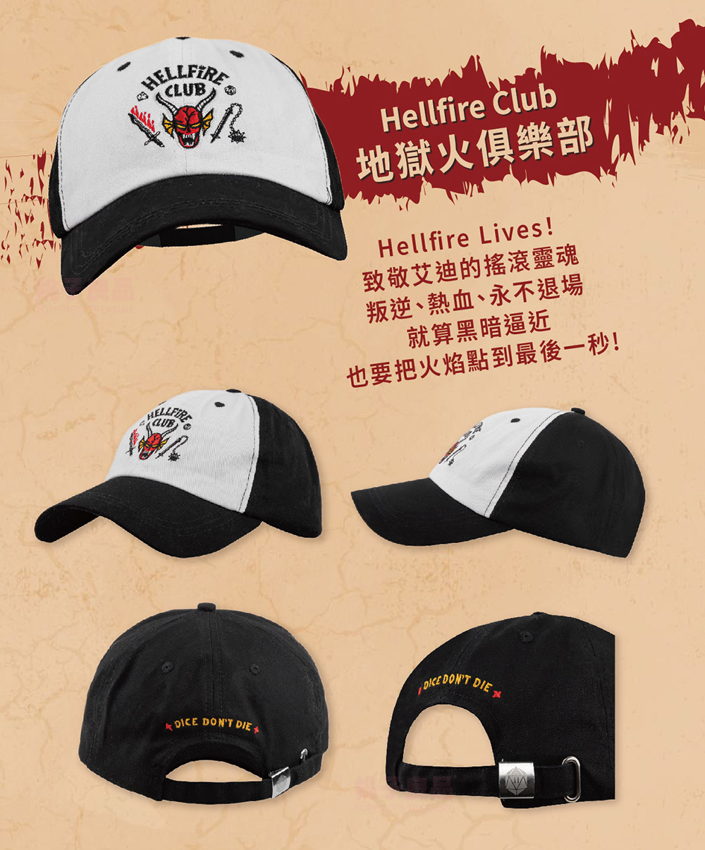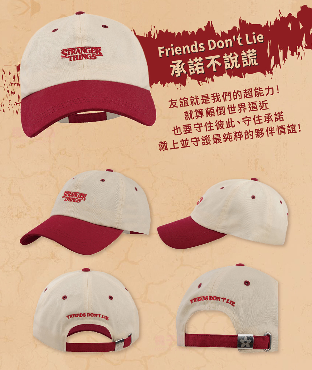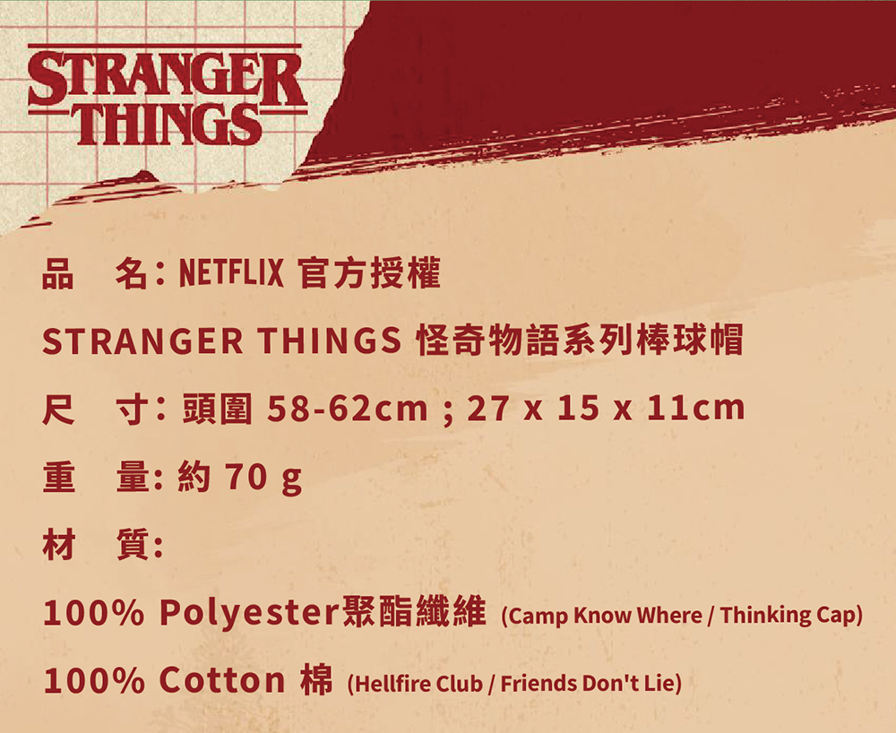 【產品規格】包裝內容物:官方授權|Stranger Things 怪奇物語系列 隨身戰備棒球帽 X 1材 質 :100%聚酯纖維(Camp Know Where / Thinking Cap)、100%棉(Hellfire Club / Friends Don't Lie)重 量 :約 70 g商品尺寸 :27 x 15 x 11cm(頭圍 58-62cm)產 地 :中國大陸