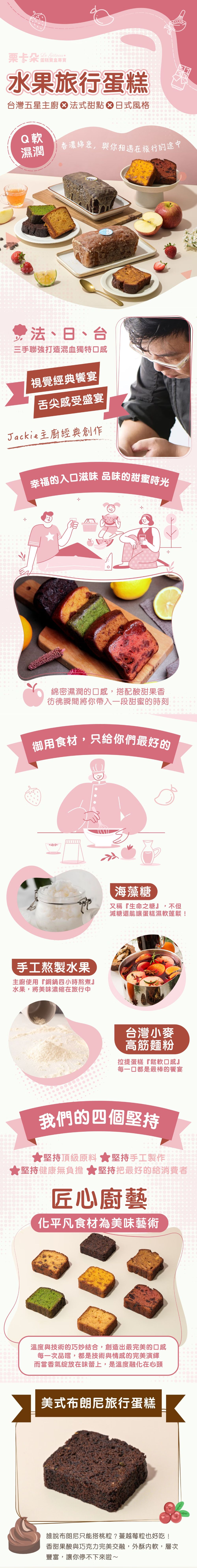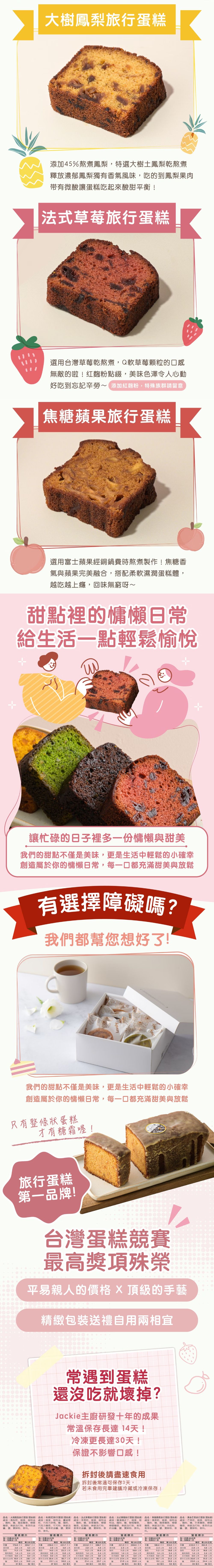 商品內容商品組合/規格:旅行蛋糕60g/片x8(口味隨機)商品品名:雲朵之誕綜合水果旅行蛋糕8入禮盒商品重(容)量:480g±10%/盒內容物成分(口味隨機出貨):美式布朗尼旅行蛋糕-蔓越莓乾、耐烤巧克力塊、雞蛋、糖、海藻糖、鹽、高筋麵粉、可可粉、無鋁泡打粉、寶鮮粉、植物油、香料、香草奶油醬、巧克力醬、糖霜(檸檬汁、糖粉)柑橘抹茶旅行蛋糕-檸檬汁、雞蛋、糖、海藻糖、靜岡抹茶粉、綠藻粉、鹽、高筋麵粉、無鋁泡打粉、寶鮮粉、植物油、香料、香草奶油醬、柳橙糖漿、蜜漬柳橙皮、糖霜(檸檬汁、糖粉)黃金芒果旅行蛋糕-胡蘿蔔素、雞蛋、糖、海藻糖、鹽、高筋麵粉、無鋁泡打粉、寶鮮粉、植物油、香料、香草奶油醬、芒果糖漿、芒果果乾、糖霜(檸檬汁、糖粉)法式草莓旅行蛋糕-紅麴粉、雞蛋、糖、海藻糖、鹽、高筋麵粉、無鋁泡打粉、寶鮮粉、植物油、香料、香草奶油醬、草莓糖漿、草莓果乾、糖霜(檸檬汁、糖粉)法式檸檬旅行蛋糕-檸檬汁、雞蛋、糖、海藻糖、鹽、高筋麵粉、無鋁泡打粉、寶鮮粉、植物油、香料、香草奶油醬、柳橙糖漿、蜜漬檸檬皮、糖霜(檸檬汁、糖粉)焦糖蘋果旅行蛋糕-檸檬汁、雞蛋、黑糖、海藻糖、鹽、高筋麵粉、無鋁泡打粉、寶鮮粉、植物油、香料、香草奶油醬、蘋果糖漿、蘋果果乾、焦糖醬、糖霜(檸檬汁、糖粉)大樹鳳梨旅行蛋糕-鳳梨乾、雞蛋、高筋麵粉、海藻糖、糖、無鋁泡打粉、鹽、鳳梨糖漿、香料、糖霜(檸檬汁、糖粉)、寶鮮粉、香草奶油醬、植物油食品添加物名稱:如成分所示過敏原資訊:本產品含蛋、麩質的穀類、大豆、蜂蜜、奶類及其製品,不適合對其過敏體質者食用。原產地(國):台灣保存期限:冷凍保存90天、常溫保存30天食用方式:每片單獨包裝,開封即食。