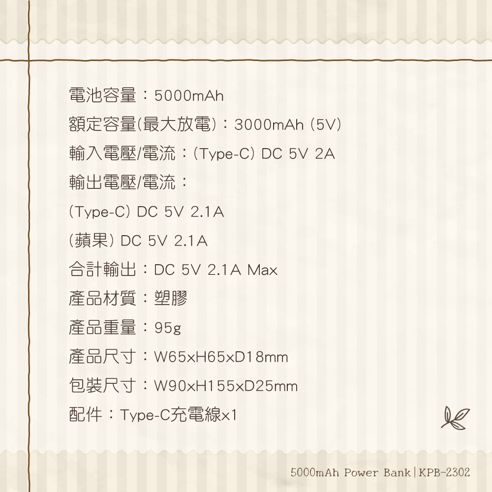 額定容量(最大放電):3000mAh (5V)