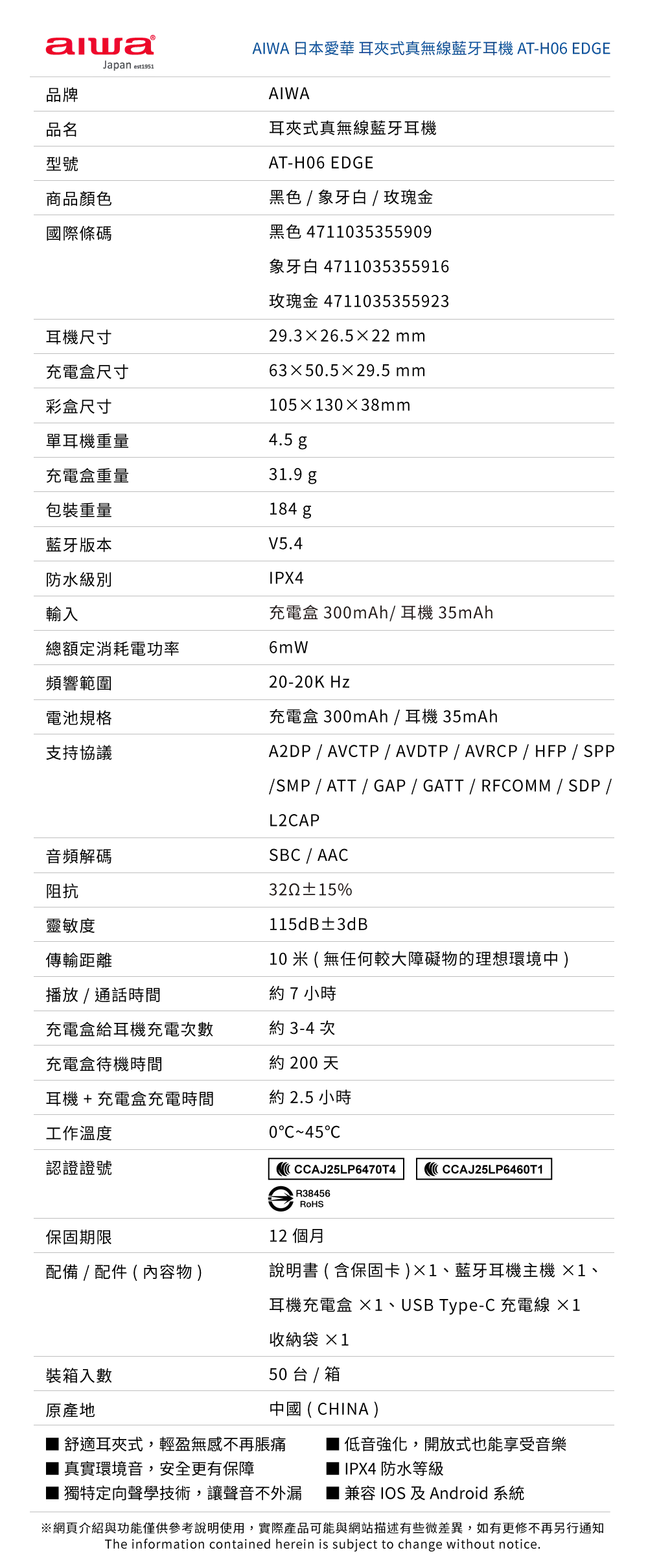 內容物:說明書(含保固卡)×1、藍牙耳機主機×1、耳機充電盒×1、USBType-C充電線×1、收納袋×1型號:AT-H06EDGE耳機尺寸:29.3×26.5×22mm充電盒尺寸:63×50.5×29.5mm單耳機重量:4.5g充電盒重量:31.9g包裝重量:184g藍牙版本:V5.4防水級別:IPX4輸入:充電盒300mAh/耳機35mAh總額定消耗電功率:6mW