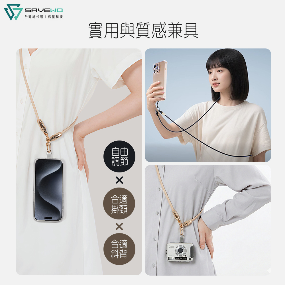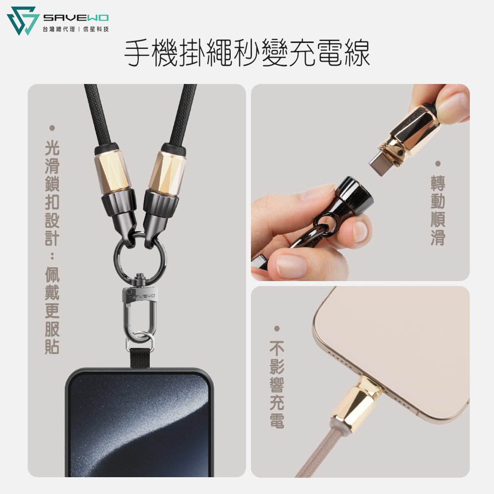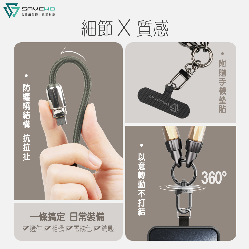 【商品特色】一線多用:掛繩×充電×數據傳輸240W PD 3.1(48V/5A)極速快充USB 2.0 最高 480 Mbps 資料傳輸防纏繞結構:不打結、不拉扯Smooth Lock 專利扭環:轉動順滑、省力開合可滑動扣環:長度自由調節,掛頸/斜背都合適光滑鎖扣設計:操作直覺,佩戴更服貼電鍍合金:高級質感、耐用輕便三色可選:石墨黑 淡雅金 墨松綠 隨心穿搭