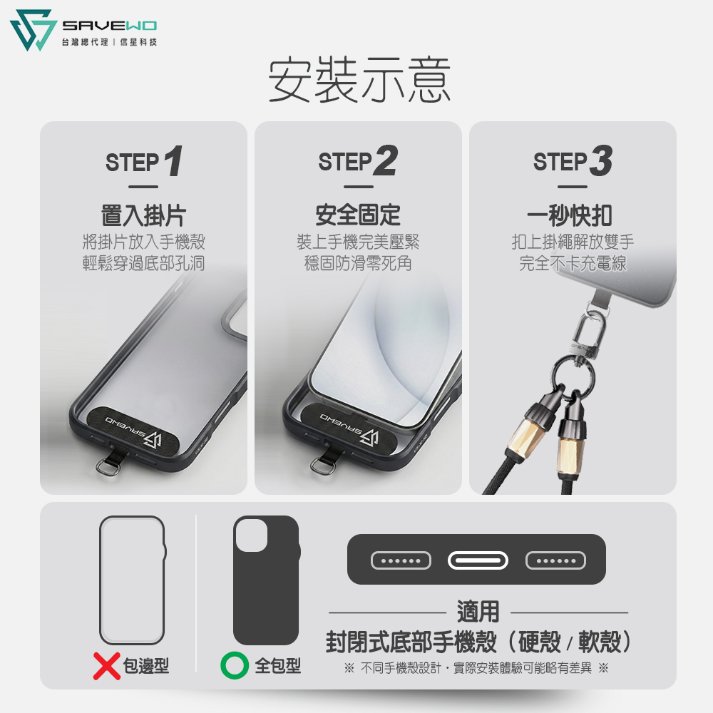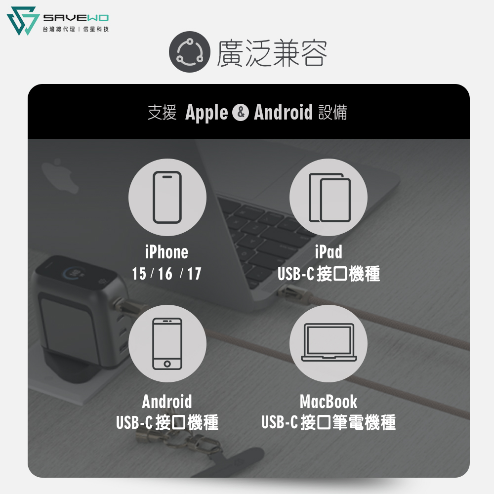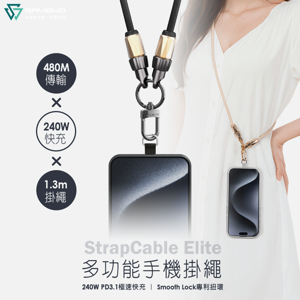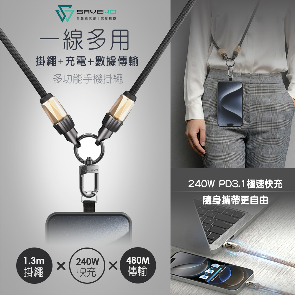 【商品規格】品牌名稱:SAVEWO 救世產品名稱:StrapCable Elite 多功能手機掛繩產品型號:SCE-CC213產品接口:USB-C to USB-C額定功率:240W Max. (48V⎓5A)傳輸速率:480Mbps (USB 2.0)快充協議:PD3.1產品長度:1.3m本體淨重:93.5g±5包裝內容:多功能手機掛繩x1保固期限:12個月