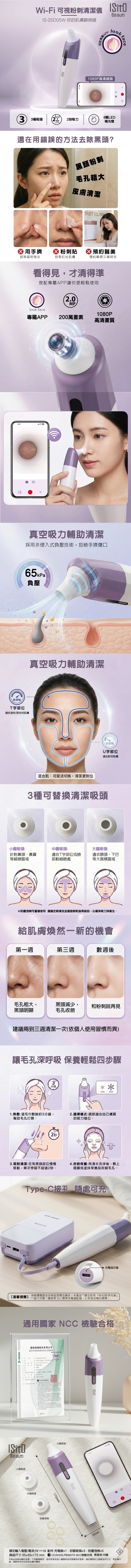 ◆ Wi-Fi × 1080P高畫質數位鏡頭,清晰觀察毛孔狀況與肌膚細節。 ◆真空吸力輔助清潔×保護,提升肌膚穩定度 ◆黑頭、粉刺吸出過程透過可視畫面一覽無遺,即時觀察皮膚狀態。 ◆三種可替換清潔吸頭, 自由選用 ◆提供高、低兩段吸力模式,可依照膚質敏感度或使用區域自由切換 ◆吸頭可拆清洗, 防塵泡棉可重複使用 ◆有助於肌膚更有效吸收後續保養品,提升保養效率 ◆溫和不拉扯肌膚,適用多種膚質。