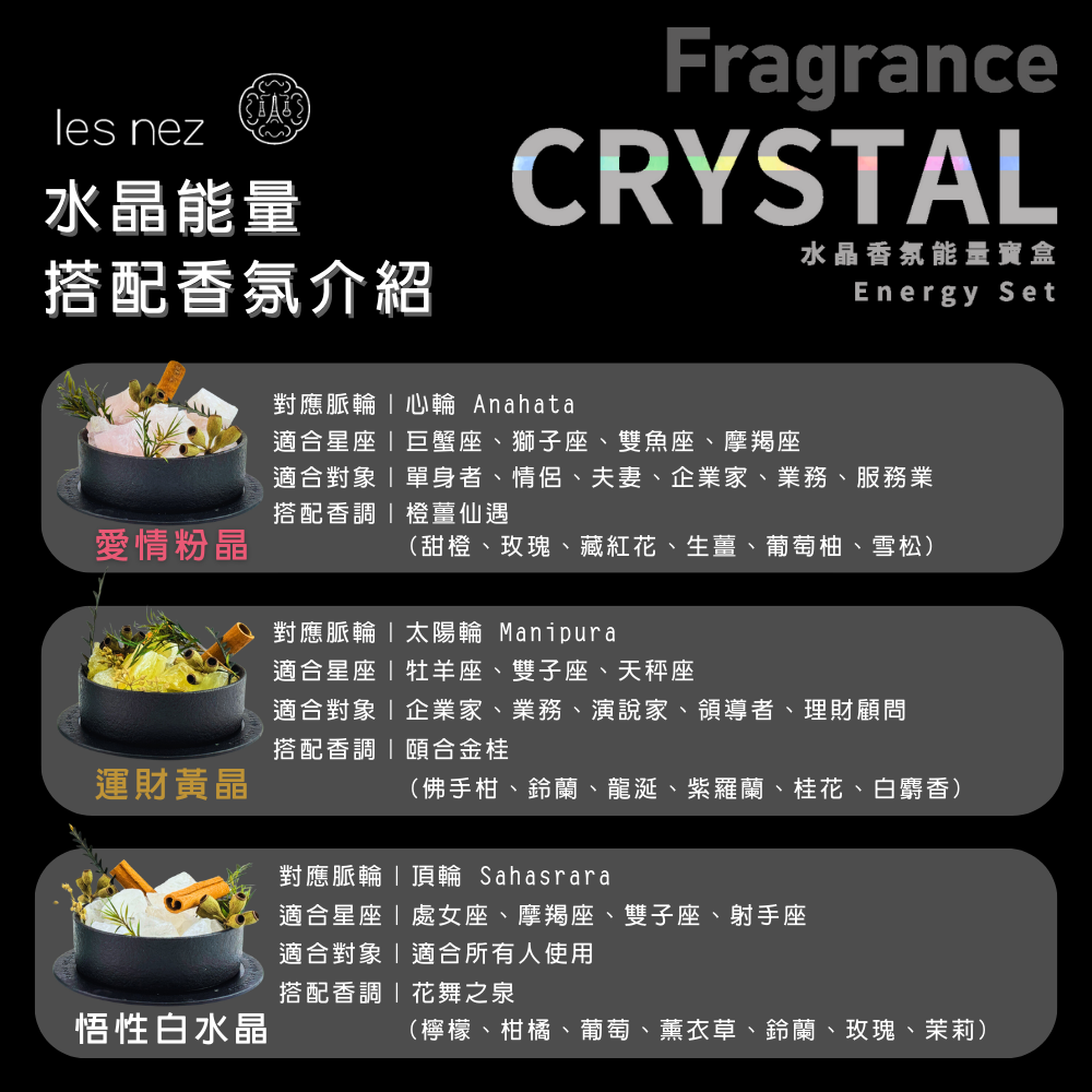 「水晶香氛能量寶盒」精選七種不同顏色水晶,每款水晶代表不同寓意與能量象徵,並搭配專屬擴香香水原精。將原精滴於水晶上,香氣自然散發,同時營造空間淨化與療癒氛圍。