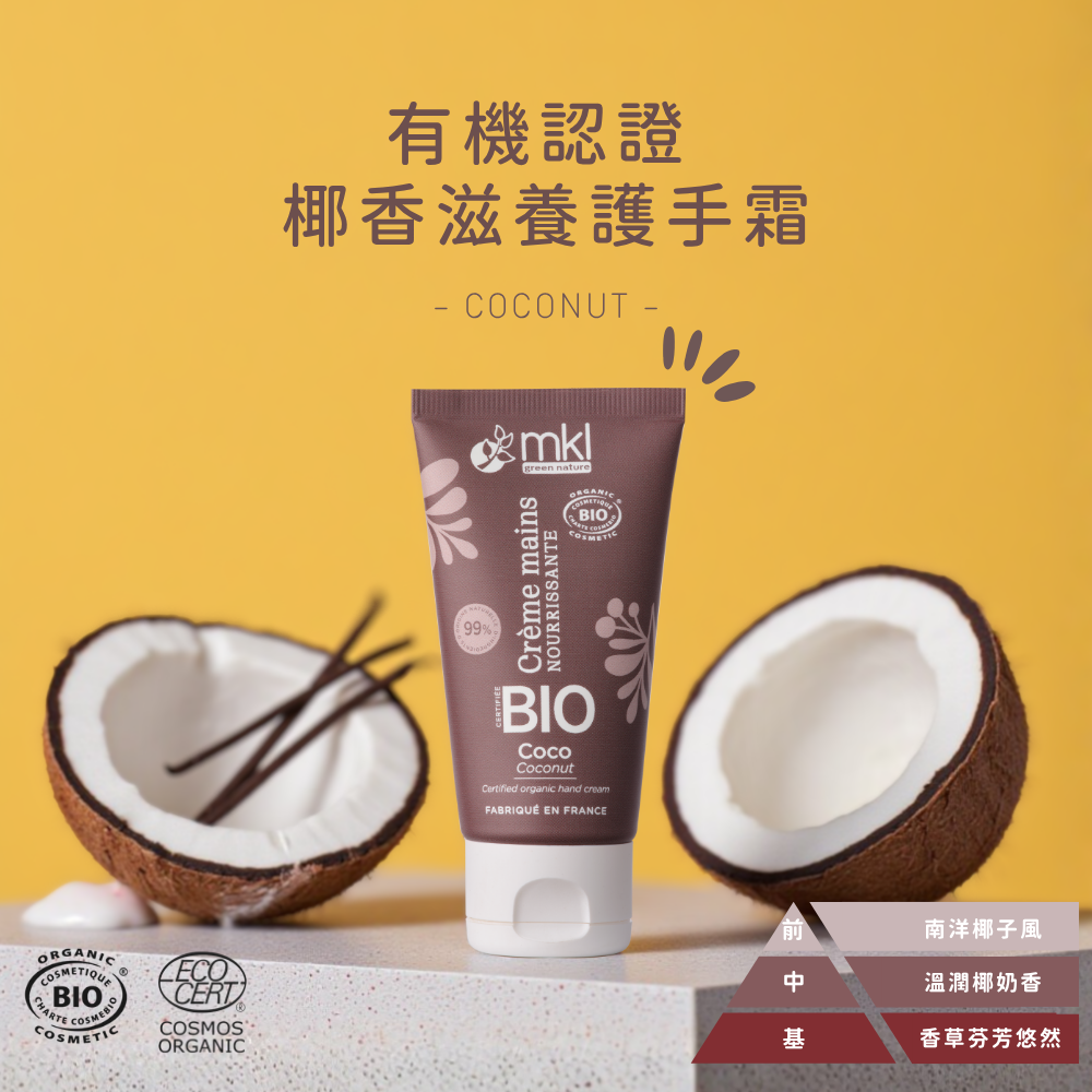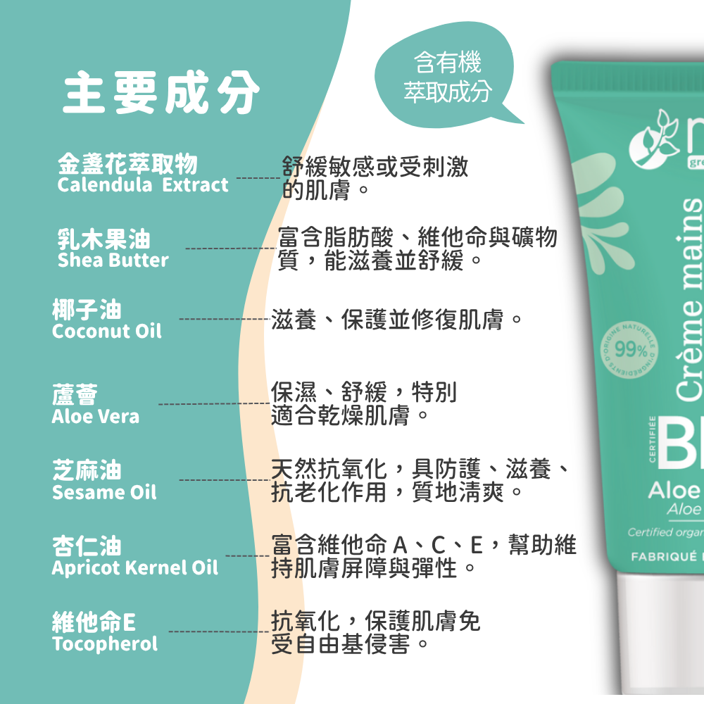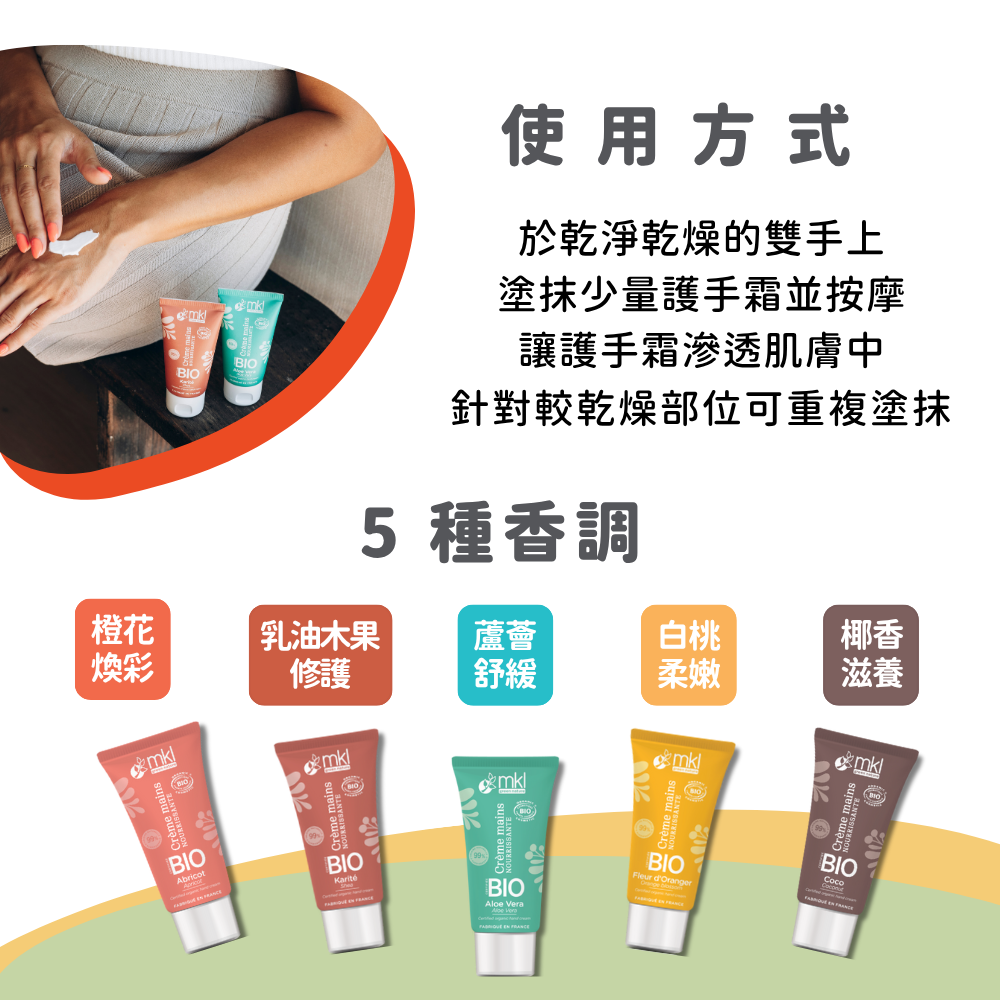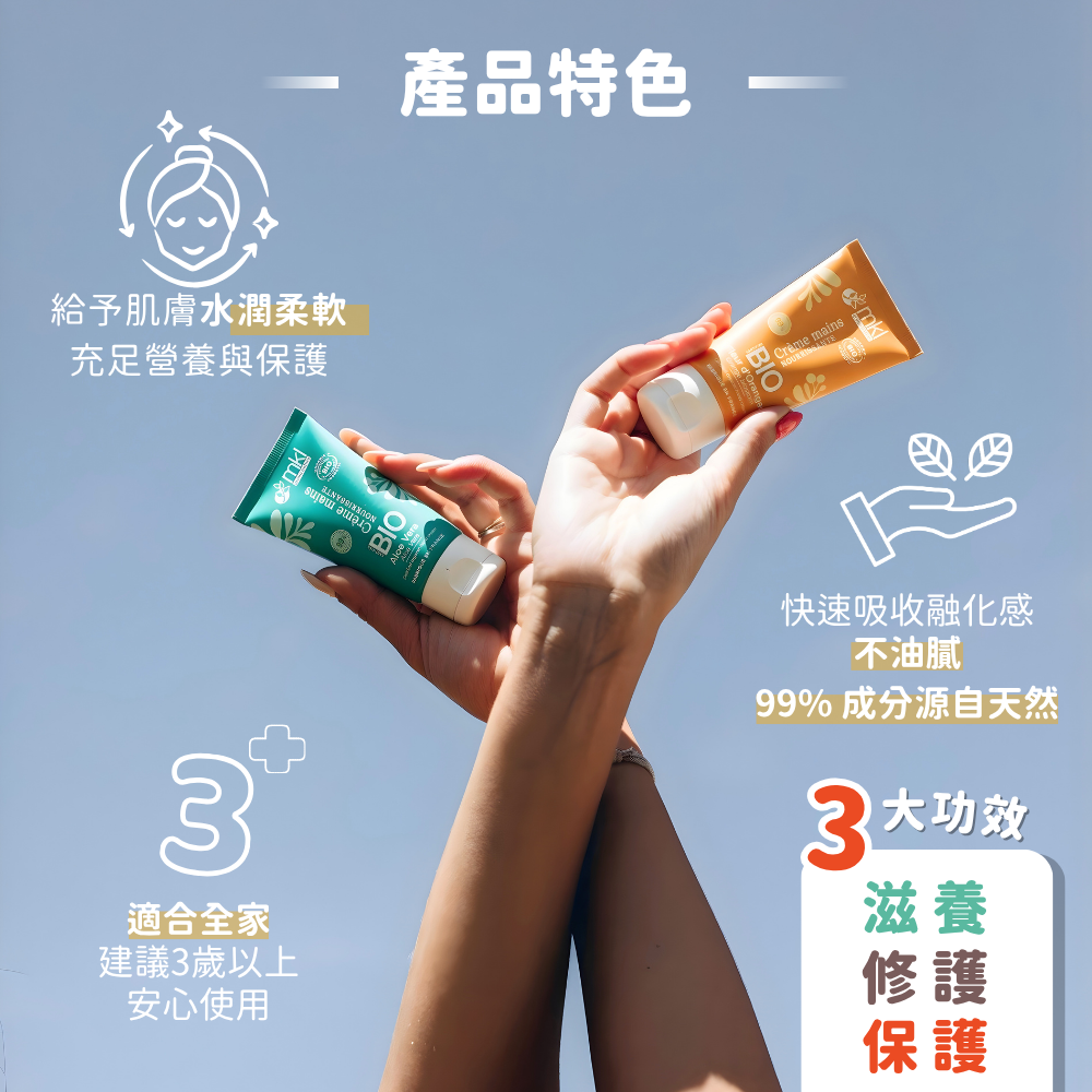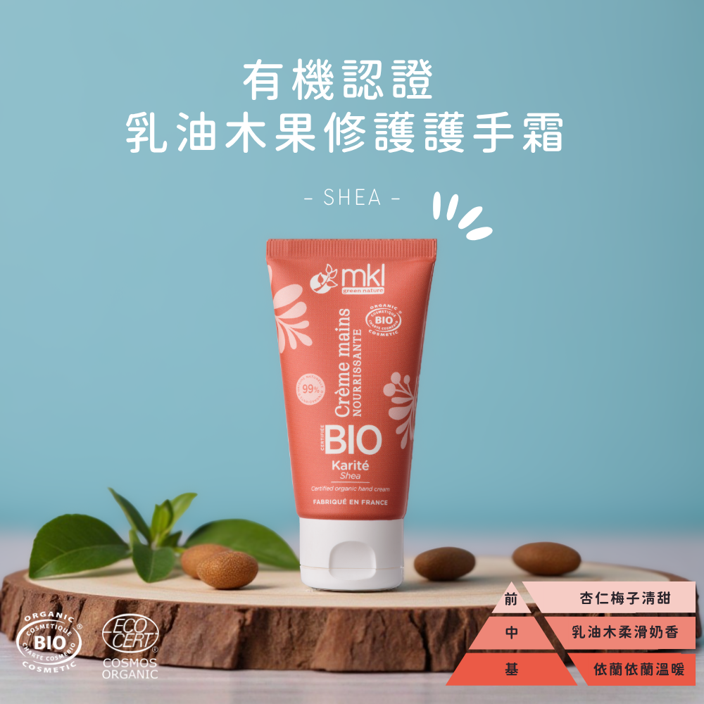 來自法國的有機護手霜,採用天然植物油與有機認證成分,溫和修護乾燥雙手,快速吸收不黏膩。