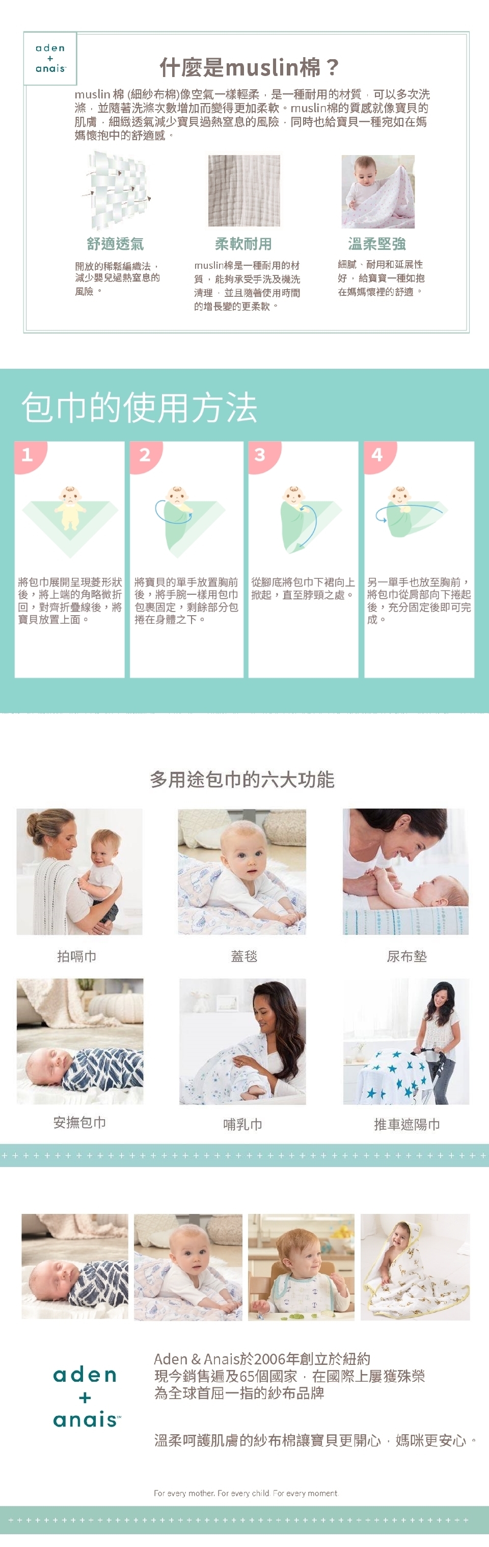 美國品牌aden + anais 採用經典簡約設計,搭配花朵圖樣,氣質可愛,陪伴寶寶溫暖成長。