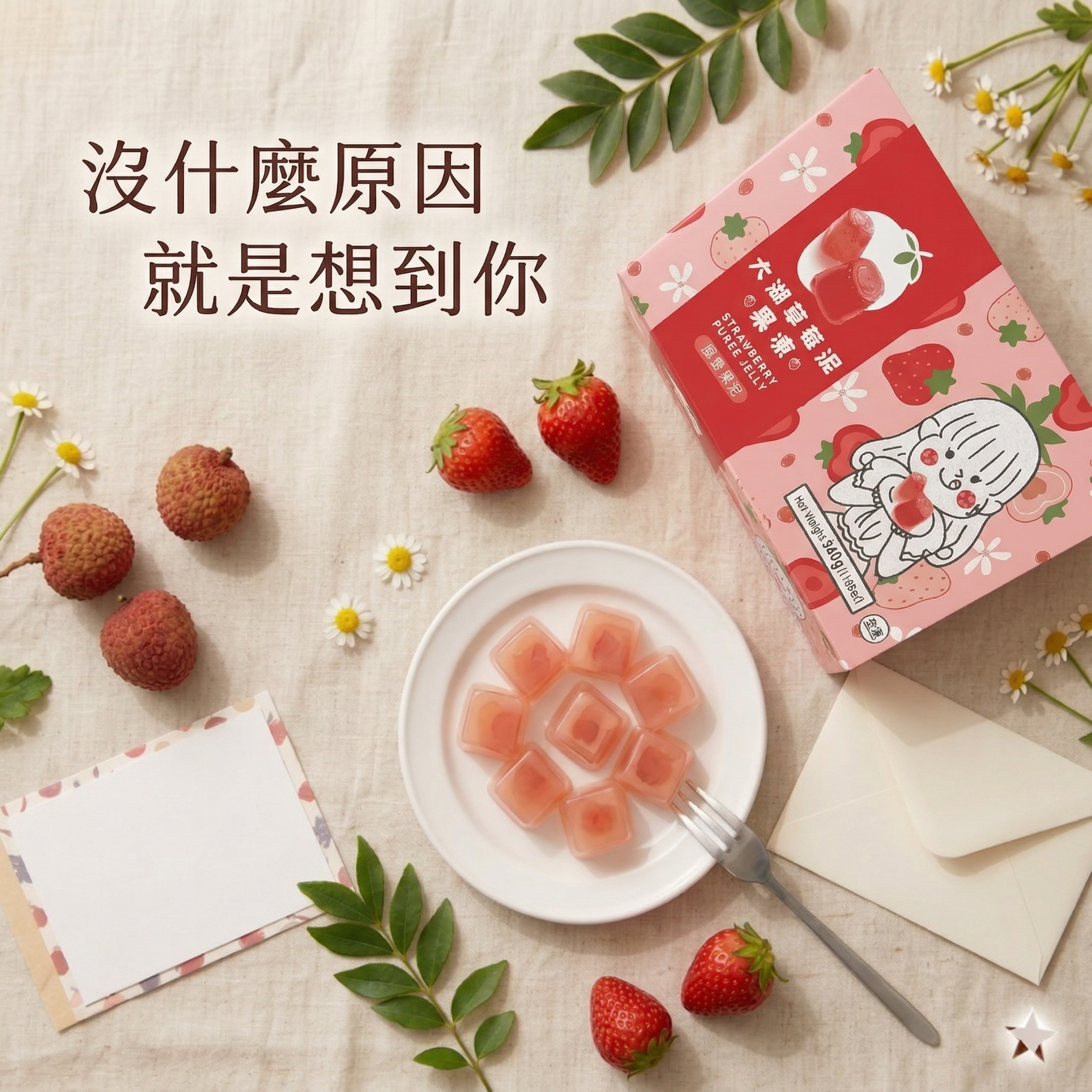 🌱 天然草莓香氣 × 細緻柔滑果凍將草莓泥均勻融入果凍中,口感柔滑帶點果粒感,吃起來清爽不膩,還多了草莓泥特有的香甜與果韻。