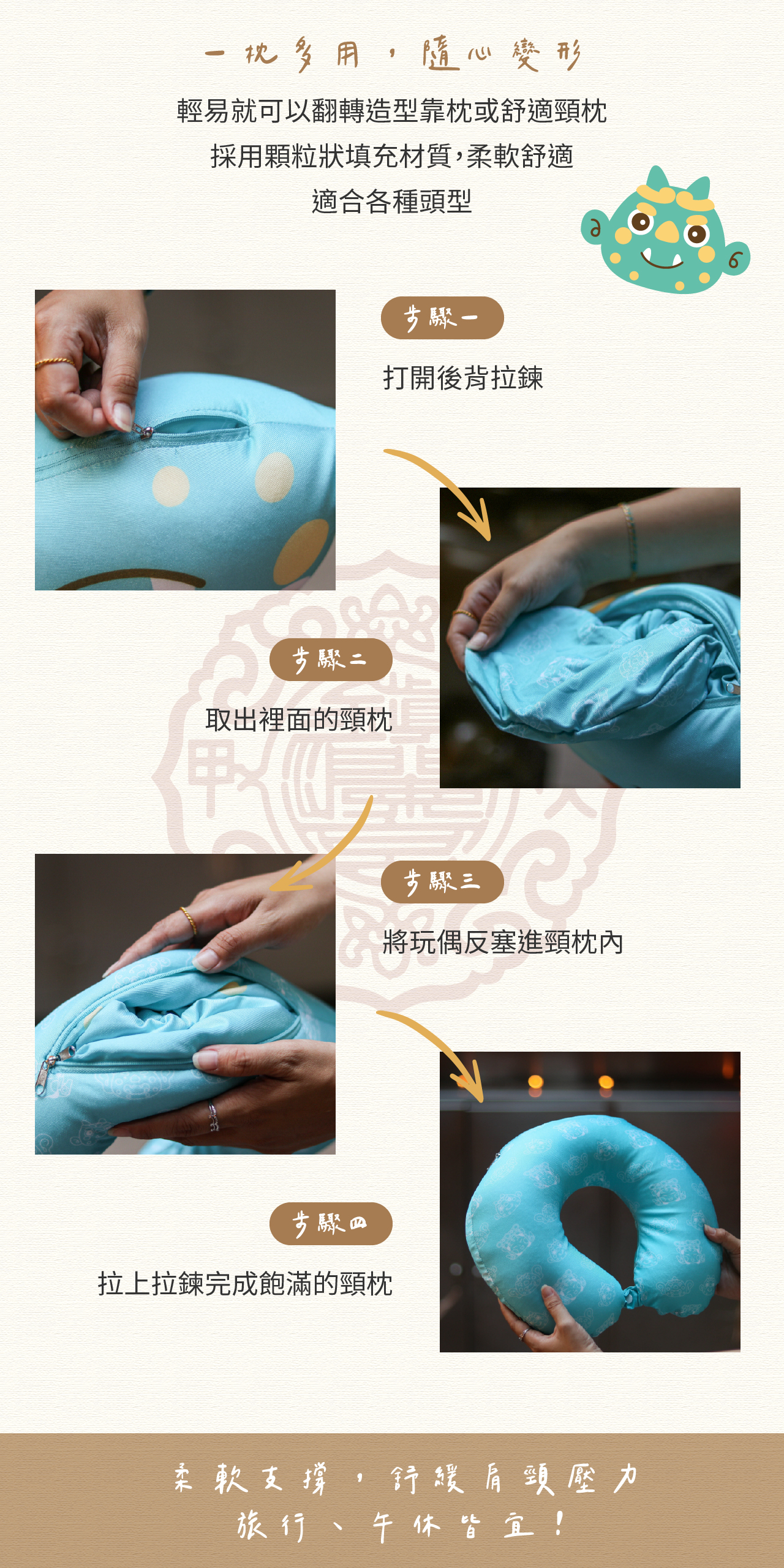 一枕多用,隨心變形輕易就可以翻轉造型靠枕或舒適頸枕採用顆粒狀填充材質,柔軟舒適適合各種頭型