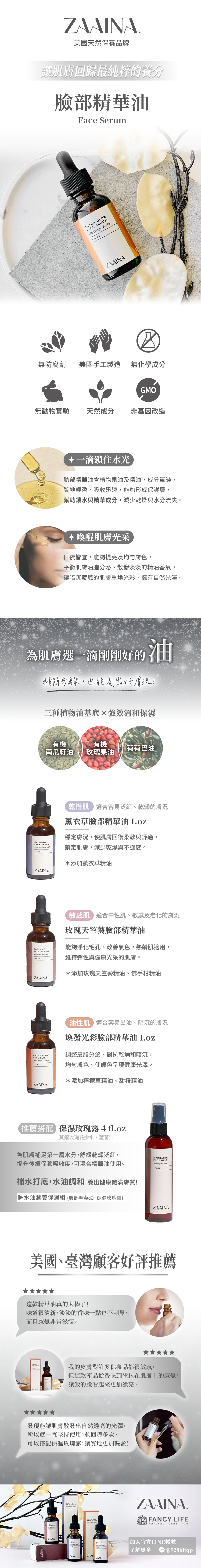 搭配玫瑰果油與南瓜籽油的滋養特性,在保濕同時不造成厚重負擔,讓膚質看起來更加透亮清新,特別適合油性、混合性或容易暗沉的肌膚日常調理使用。