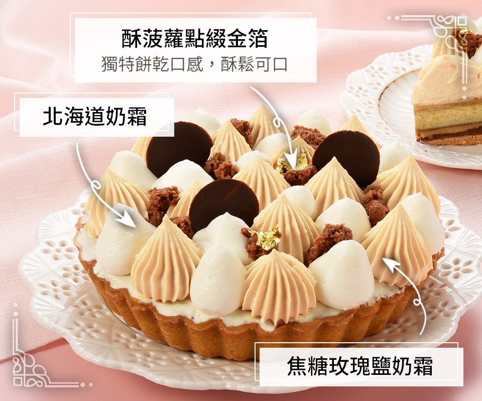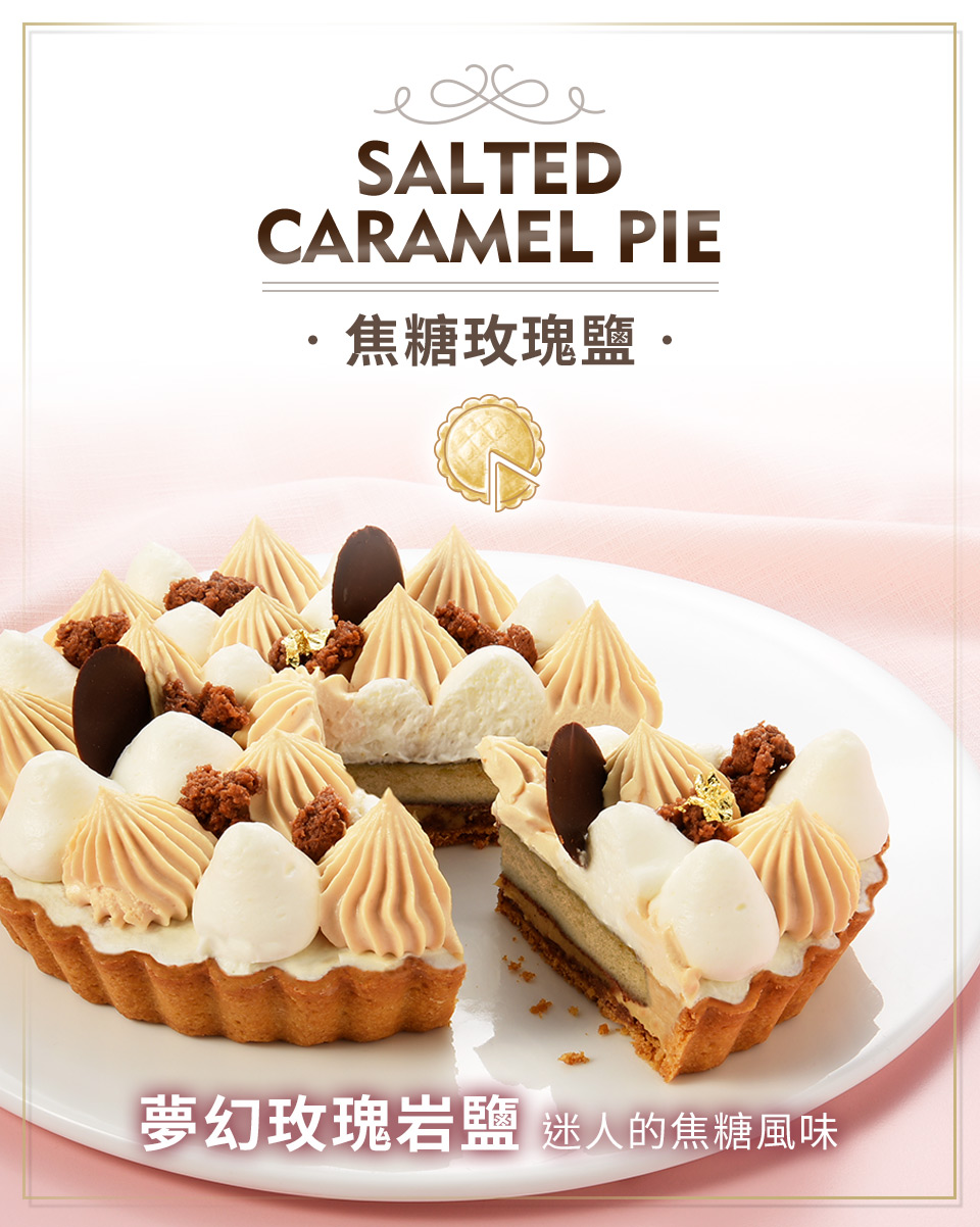 品名:焦糖玫瑰鹽派主要內容物:焦糖泡芙蛋糕/焦糖玫瑰鹽卡士達/牛奶巧克力酥波羅/焦糖玫瑰鹽奶霜/杏仁奶油派塔葷素:奶蛋素規格:6吋/盒保存期限:冷藏2~3天內食用完畢,實際保存期限請見包裝標示