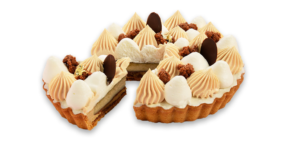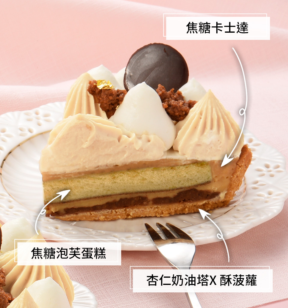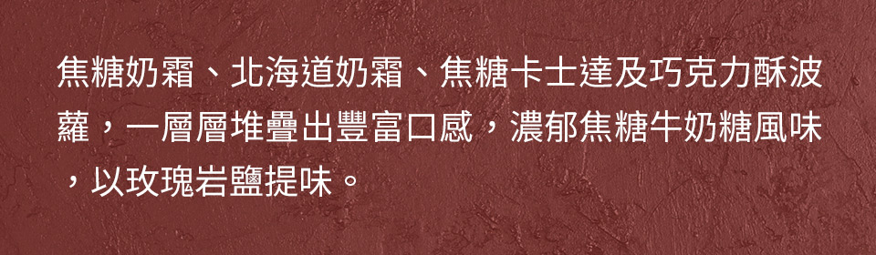表層交織著焦糖的醇厚與清爽的乳霜,玫瑰鹽輕輕劃破甜膩,留下焦糖的苦甜餘韻,最後點綴金箔與巧克力片畫下華麗句點。底部則是運用香氣濃郁的杏仁奶油派塔為基底,疊加牛奶巧克力酥菠蘿、焦糖泡芙蛋糕和焦糖玫瑰鹽卡士達,在酥脆與柔軟間嵌入驚喜的節奏與滑潤口感;手工熬煮的焦糖玫瑰鹽卡士達,以獨特的微鹹點亮焦糖的深邃,讓甜味瞬間立體靈動,這是一場視覺與味覺的盛宴。