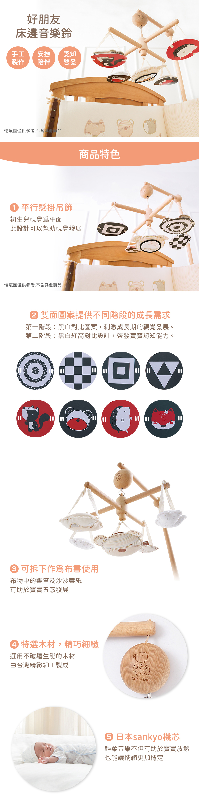 採用日本sankyo機芯,輕柔的音樂不但有助於寶寶放鬆,也能讓寶寶情緒更加穩定。