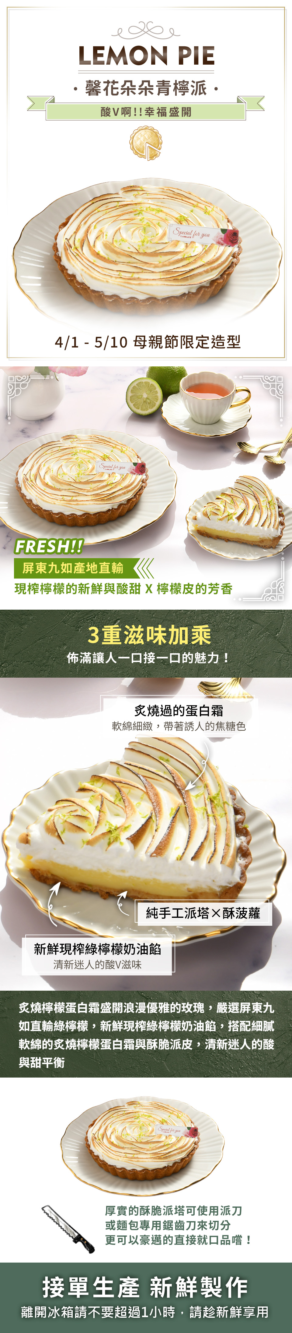 炙燒檸檬蛋白霜盛開浪漫優雅的玫瑰,嚴選屏東九如直輸綠檸檬,新鮮現榨綠檸檬奶油餡,搭配細膩軟綿的炙燒檸檬蛋白霜與酥脆派皮,清新迷人的酸與甜平衡著味蕾,口感絕佳!