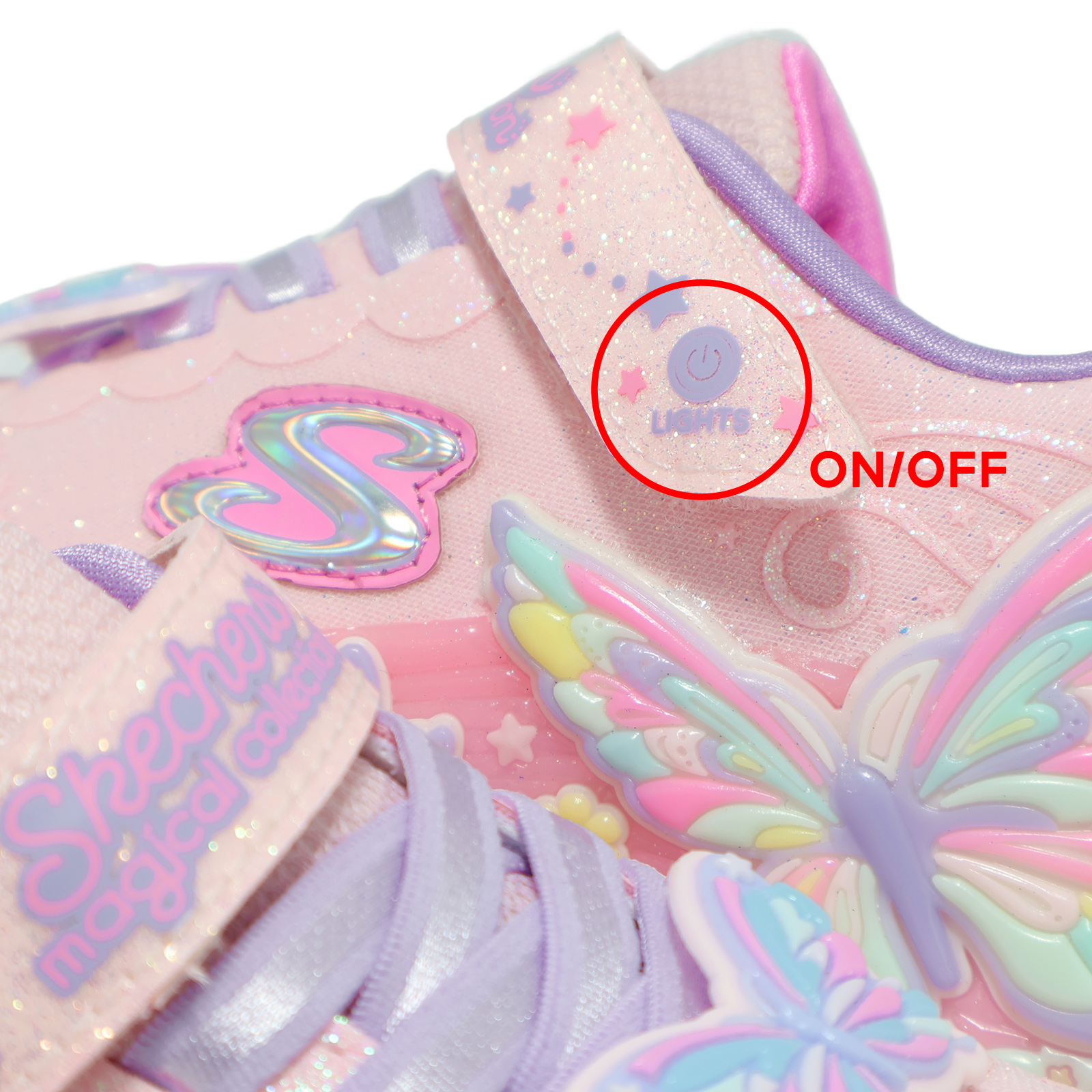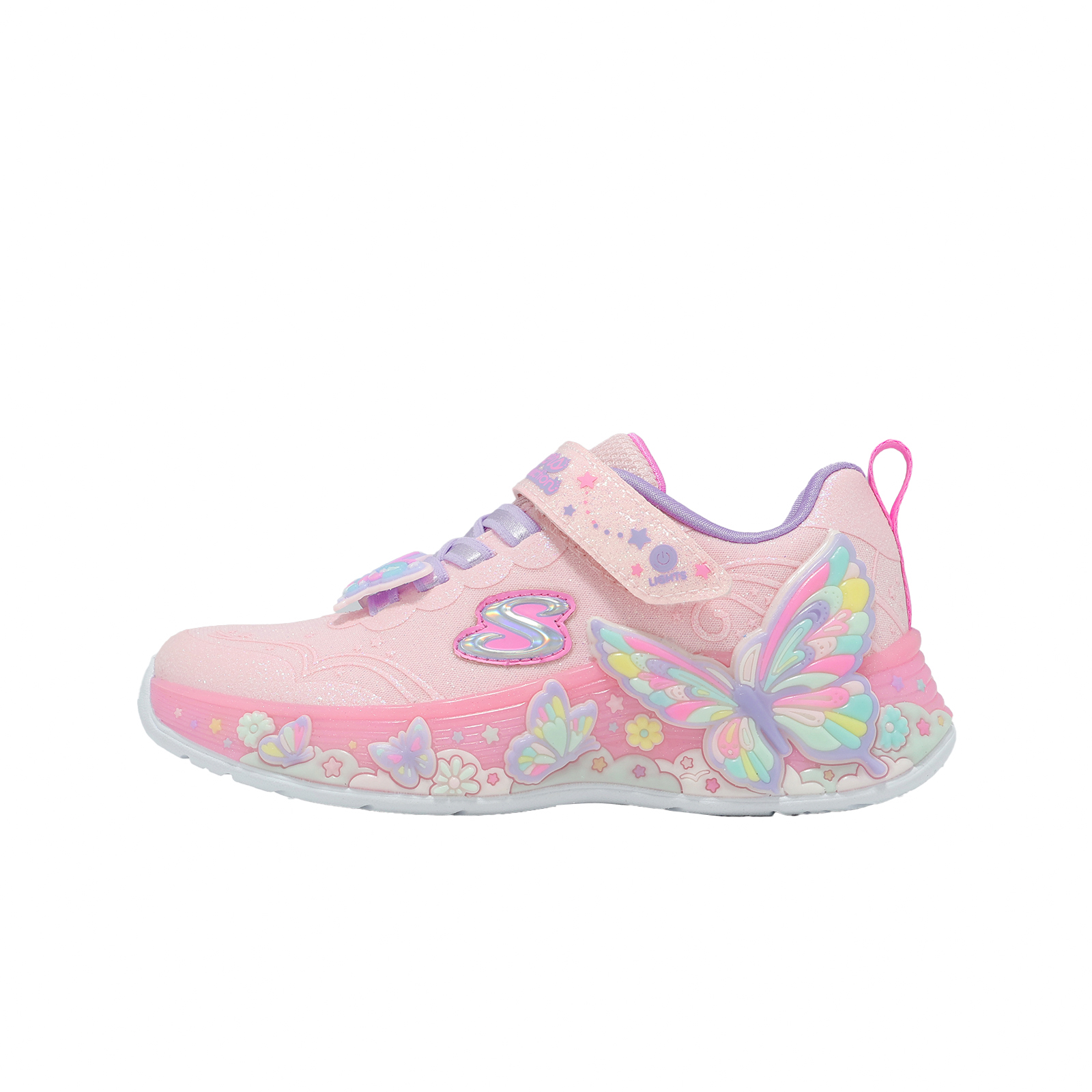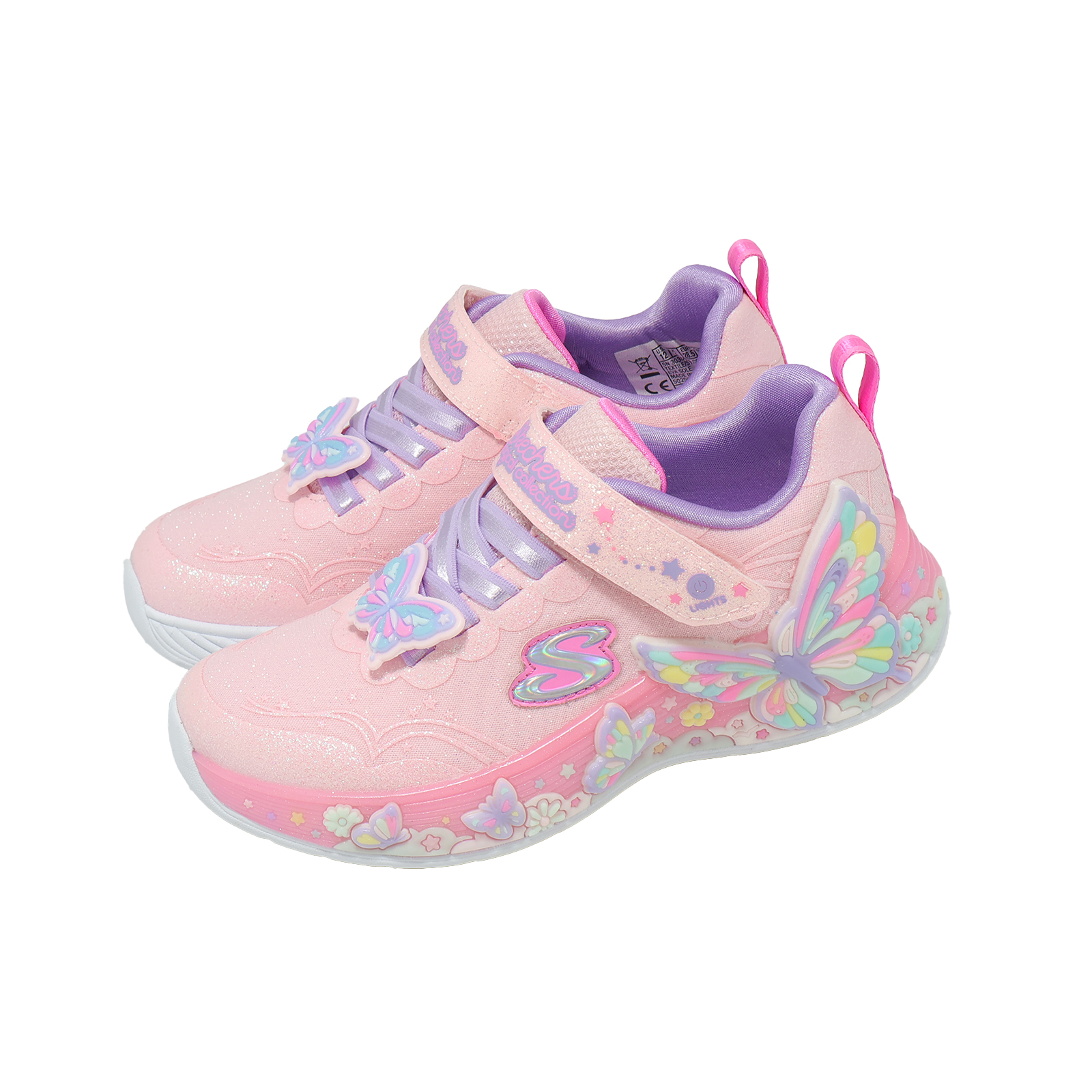 品牌: SKECHERS型號: 303065-LLPMT品名: S Lights-Butterfly Bliss版型: 版型正常BUTTERFLY BLISS 系列,蝴蝶仙子閃燈鞋,以翩翩蝴蝶的繽紛樂趣點亮每一天。這款蝴蝶主題閃燈運動鞋,採用亮粉網布鞋面,搭配蝴蝶造型裝飾和蝴蝶環繞造型中底,讓小女孩走到哪都閃耀動人。