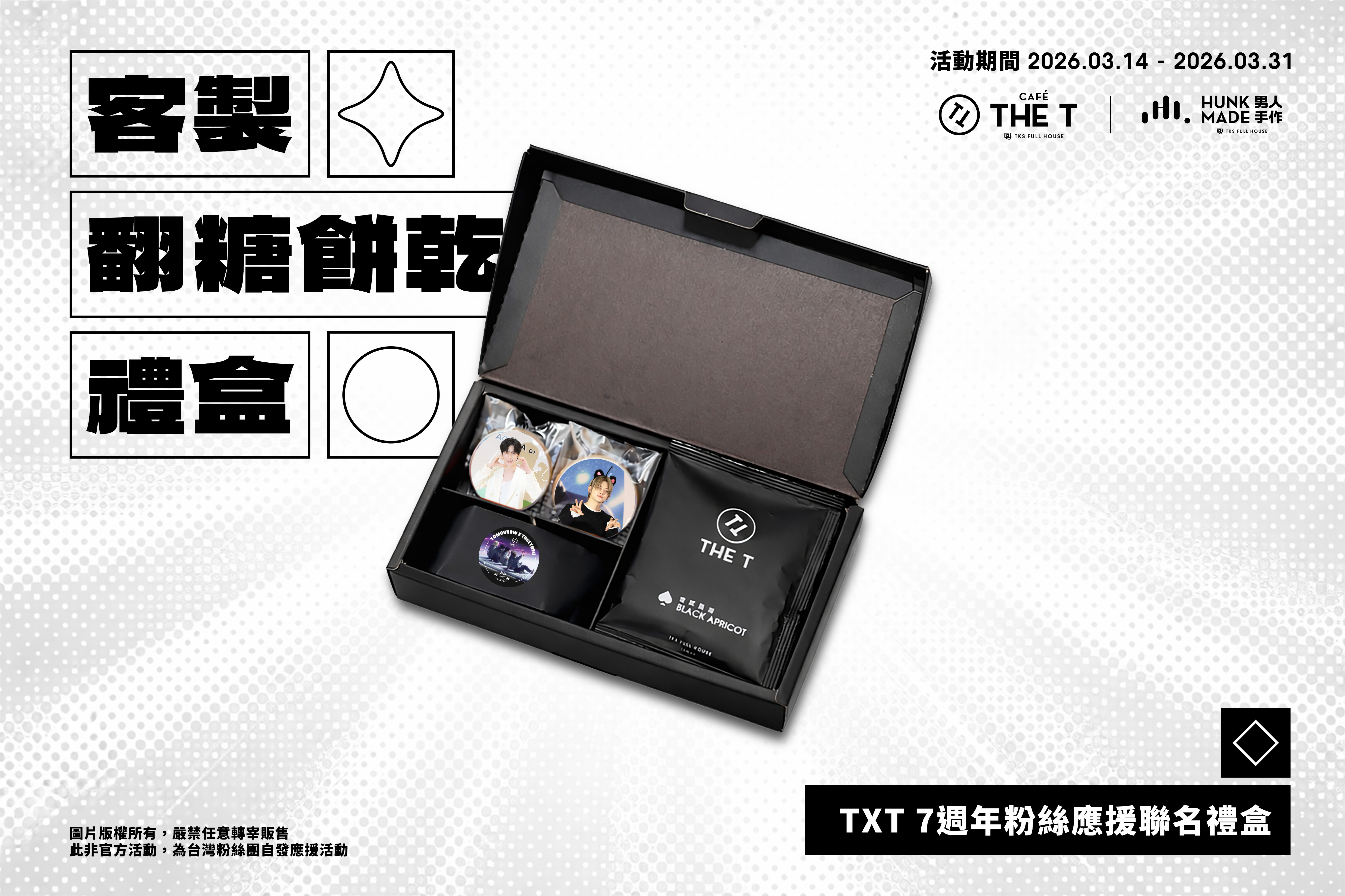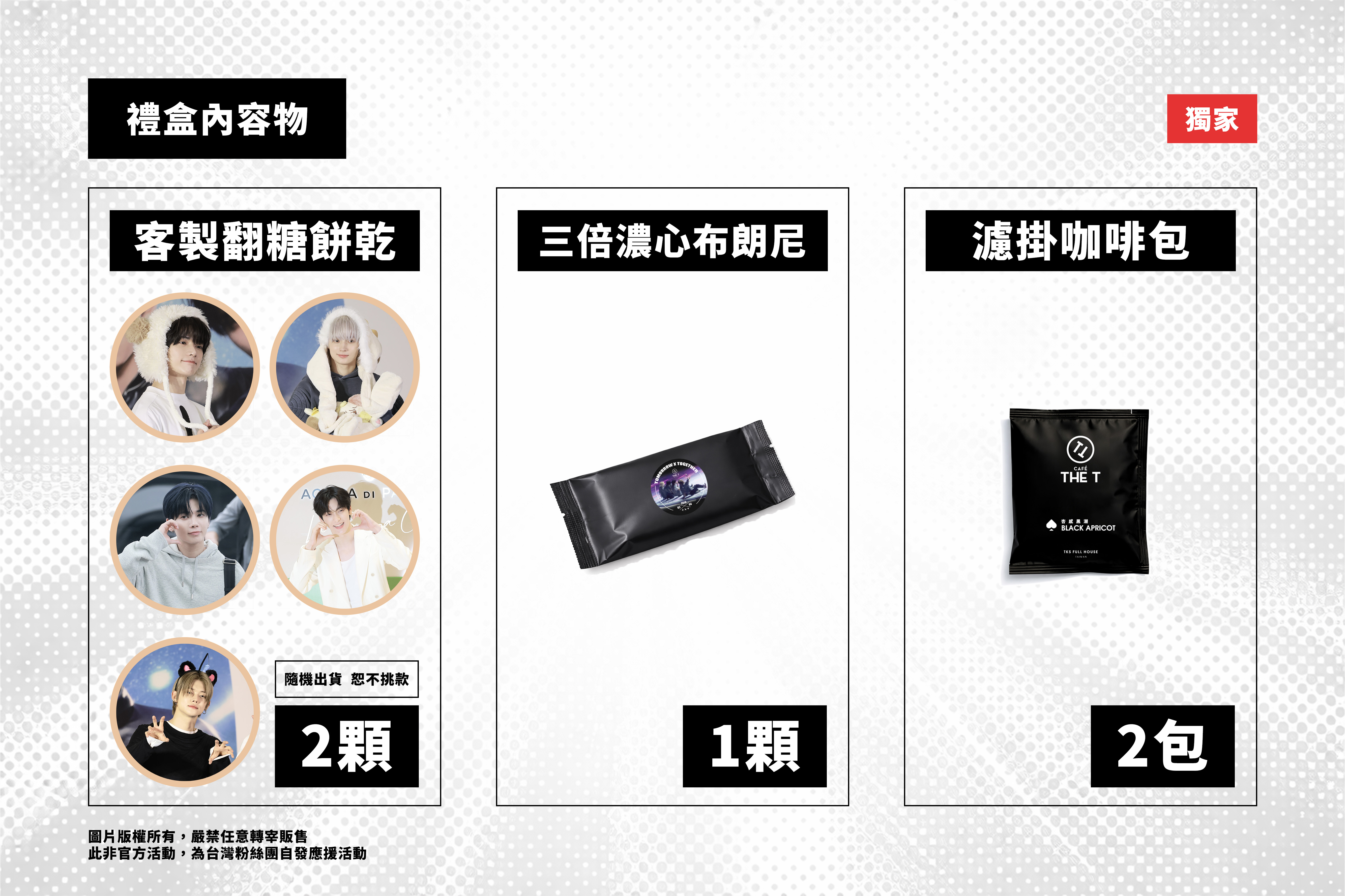‧ 產品名稱: 活動專屬│客製翻糖餅乾禮盒《曜黑禮盒》(TXT 7週年粉絲應援禮盒)(糖霜餅乾^2/布朗尼^1/咖啡濾掛包^2)
