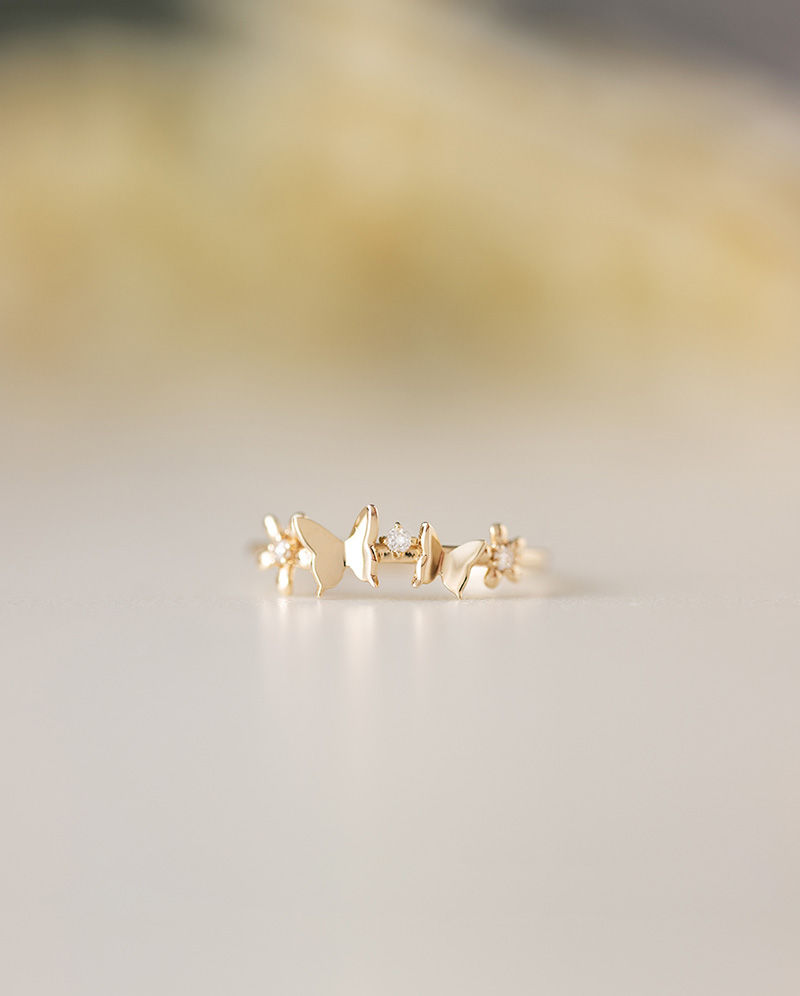 靈感來自蝴蝶振翅飛舞的瞬間當蝴蝶展開雙翼,在空氣中輕輕拍動翅膀,如同優雅的華爾滋舞步,在光影之間緩緩旋轉。戒指以蝴蝶為主角,捕捉振翅飛舞的動態與輕盈,讓自然的靈動停留於指尖/以K10金打造溫潤光澤,細膩線條勾勒出蝴蝶輕盈輪廓,呈現優雅而柔和的質感/鑽石共0.03ct