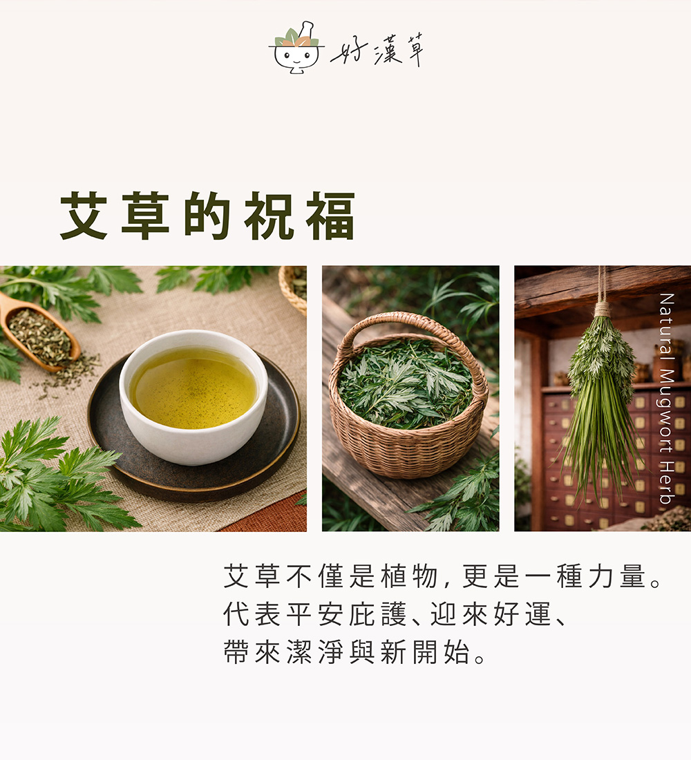 艾草: 溫經通絡,傳統上被視為招百福、除穢氣的極陽之草。