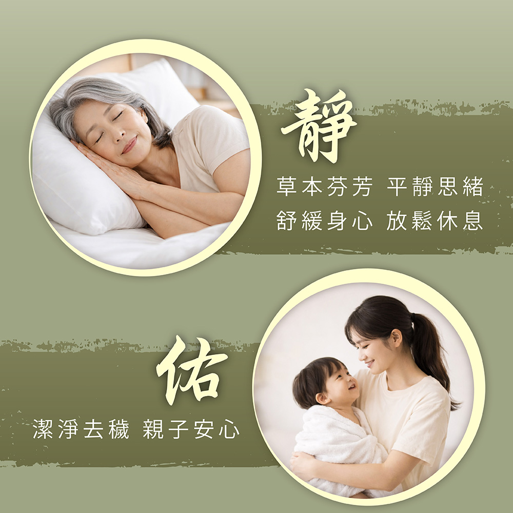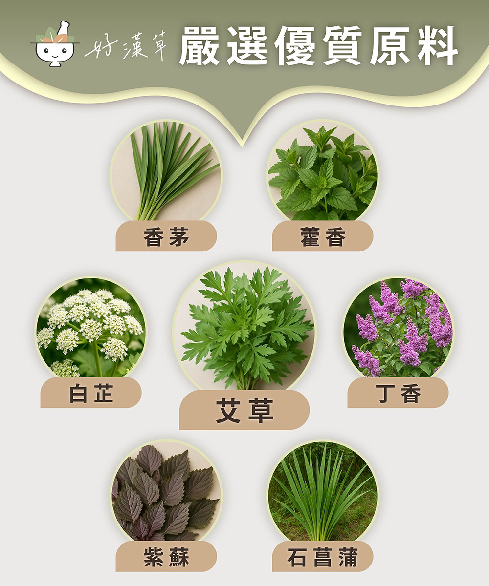 配方中的天然草本植物如艾草、藿香、白芷、丁香、紫蘇、香茅、石菖蒲等,皆有助於平衡身心,讓你擺脫壓力和疲勞,享受平靜和舒適的感覺。