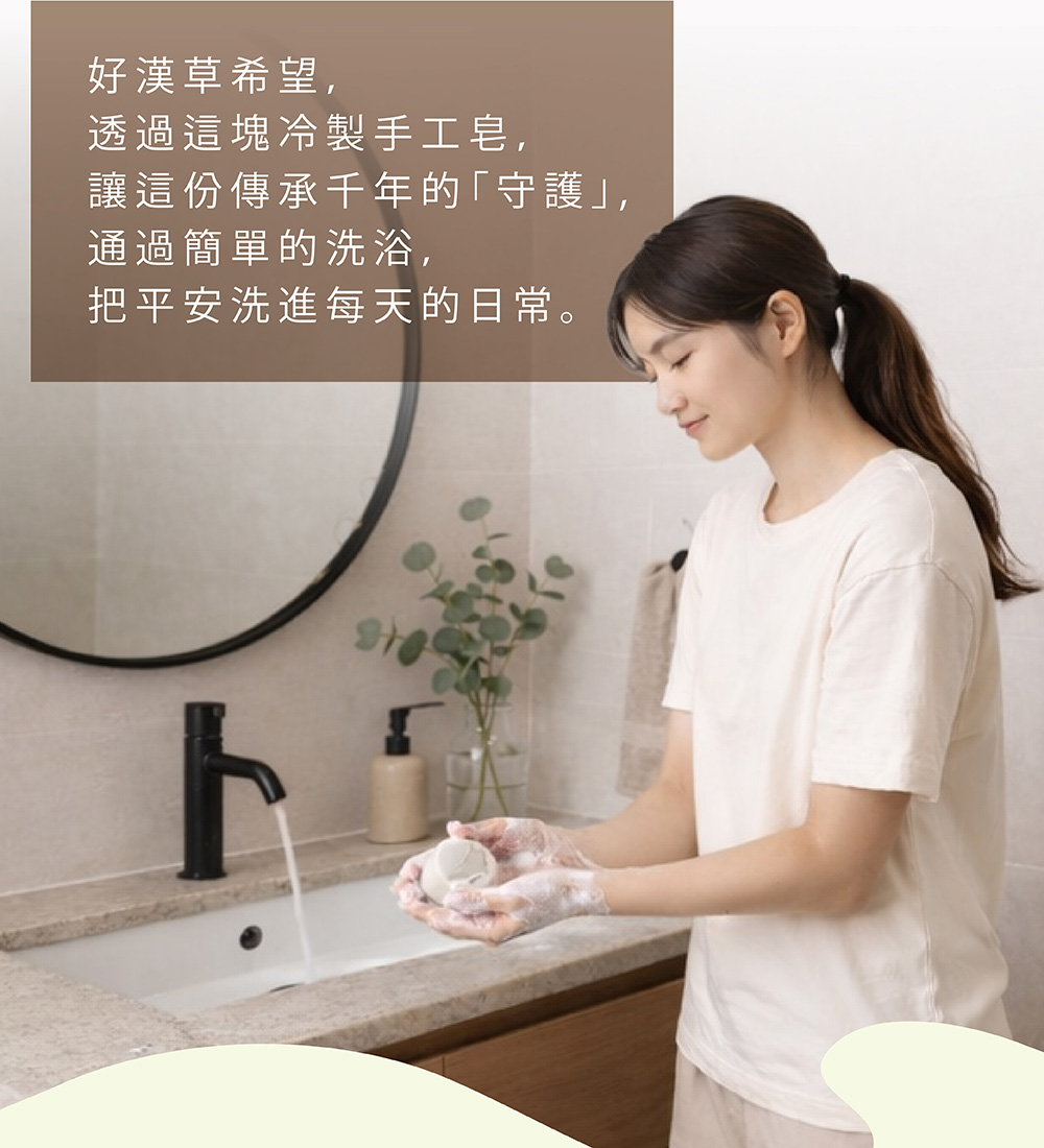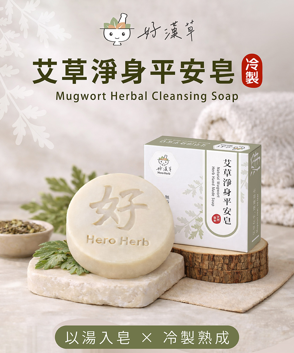 好漢草將含有 艾草、香茅、藿香、白芷、丁香、紫蘇、石菖蒲 等傳統草本的 好漢草艾草淨身平安包 的浸泡液 融入冷製手工皂,草本的淡雅氣息,陪伴你洗去一天的忙碌與疲憊。