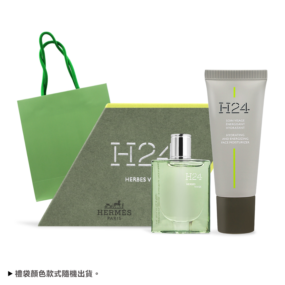 -HERMES 愛馬仕 男友必備 H24 綠動淡香精禮盒 贈禮袋1.HERMES 愛馬仕 H24 Herbes Vives 綠動淡香精禮盒[淡香精5ml+保濕面霜20ml]-國際航空版2.O'WELL 好運繽紛禮袋-小(隨機出貨)