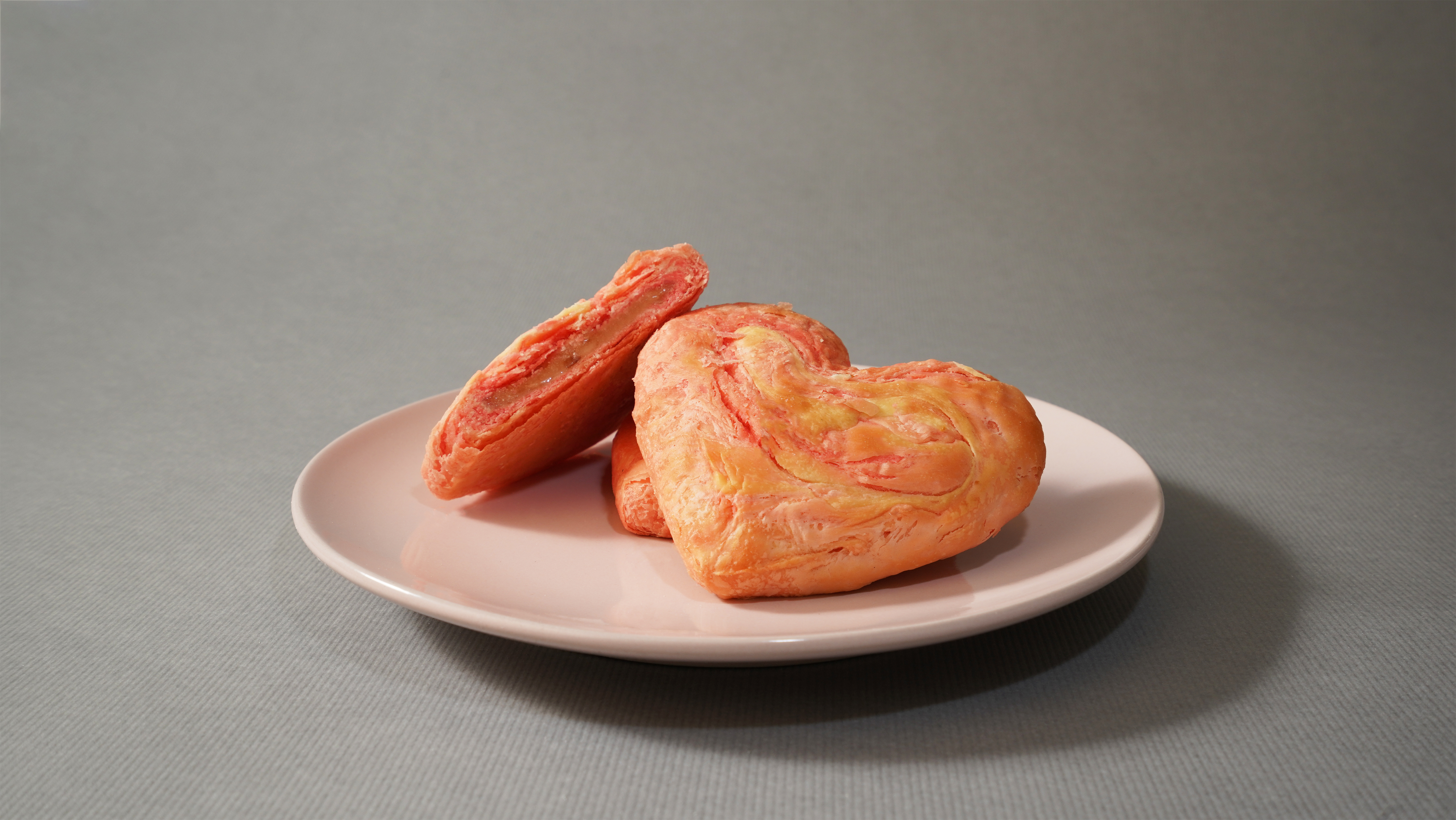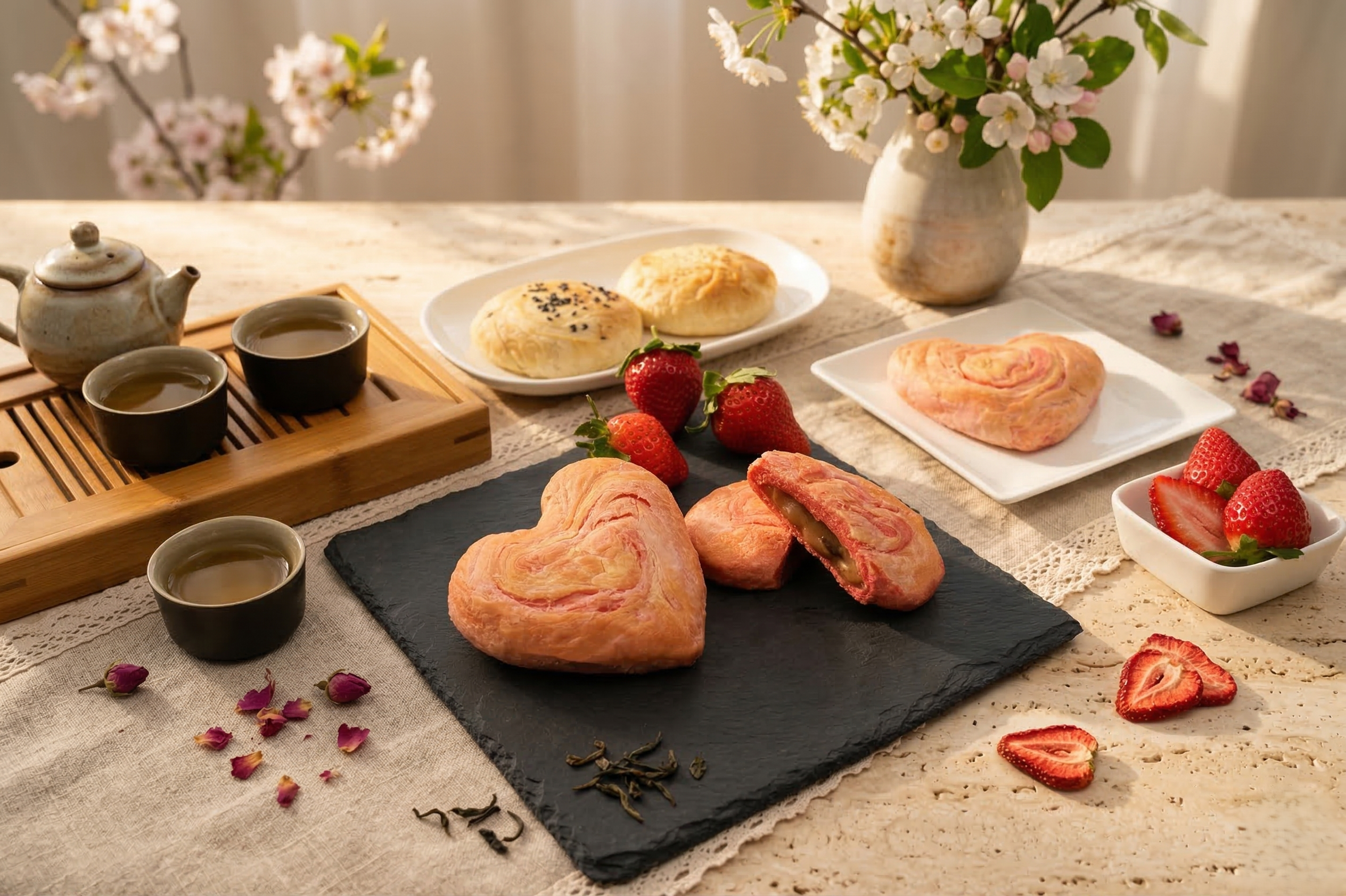 草莓梅子口味:酥皮帶草莓香氣,內餡搭配南投信義鄉梅子果肉,甜中帶酸,讓你回味戀愛的滋味,淡粉色愛心設計更添浪漫。黑糖口味:外皮與內餡拌入嚴選沖繩黑糖,經過精心烘焙,咬一口即能品味濃郁黑糖香氣,甜味四溢,口感香醇。