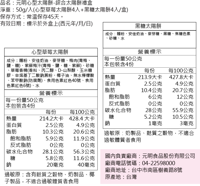 元明心型太陽餅-綜合太陽餅禮盒1盒(8入,心型草莓4入+黑糖太陽餅4入)