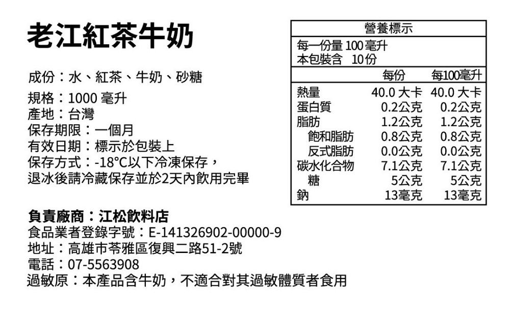 *建議先將要食用的老江紅茶牛奶放置冰箱冷藏室解凍,待化成冰沙後即可飲用
