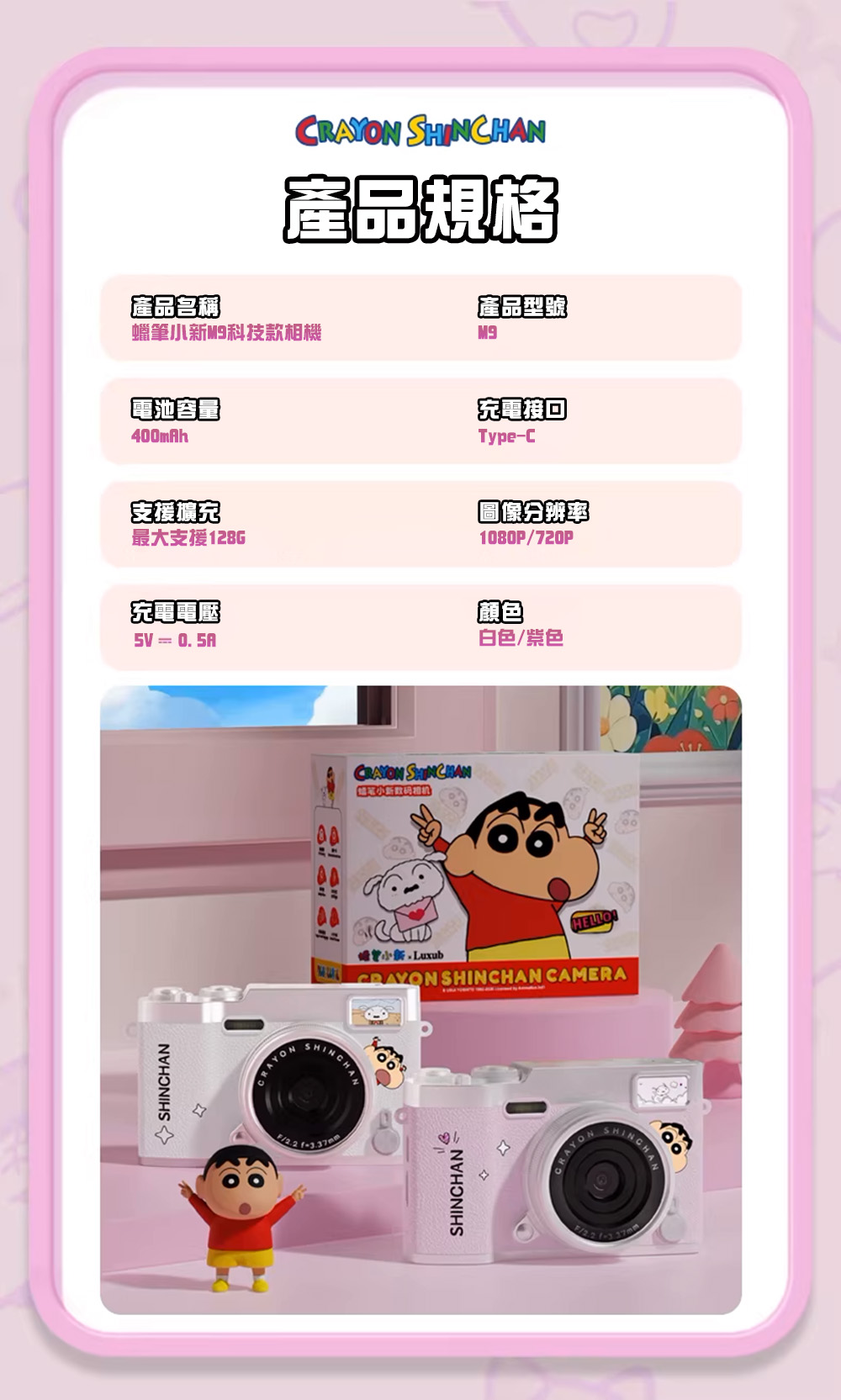 產品型號: M9產品尺寸: 110.71 × 49.82 × 64.00 mm包裝尺寸: 138 × 108 × 50 mm產品材質: ABS電池容量: 400mAh無內附記憶卡,需另外購買