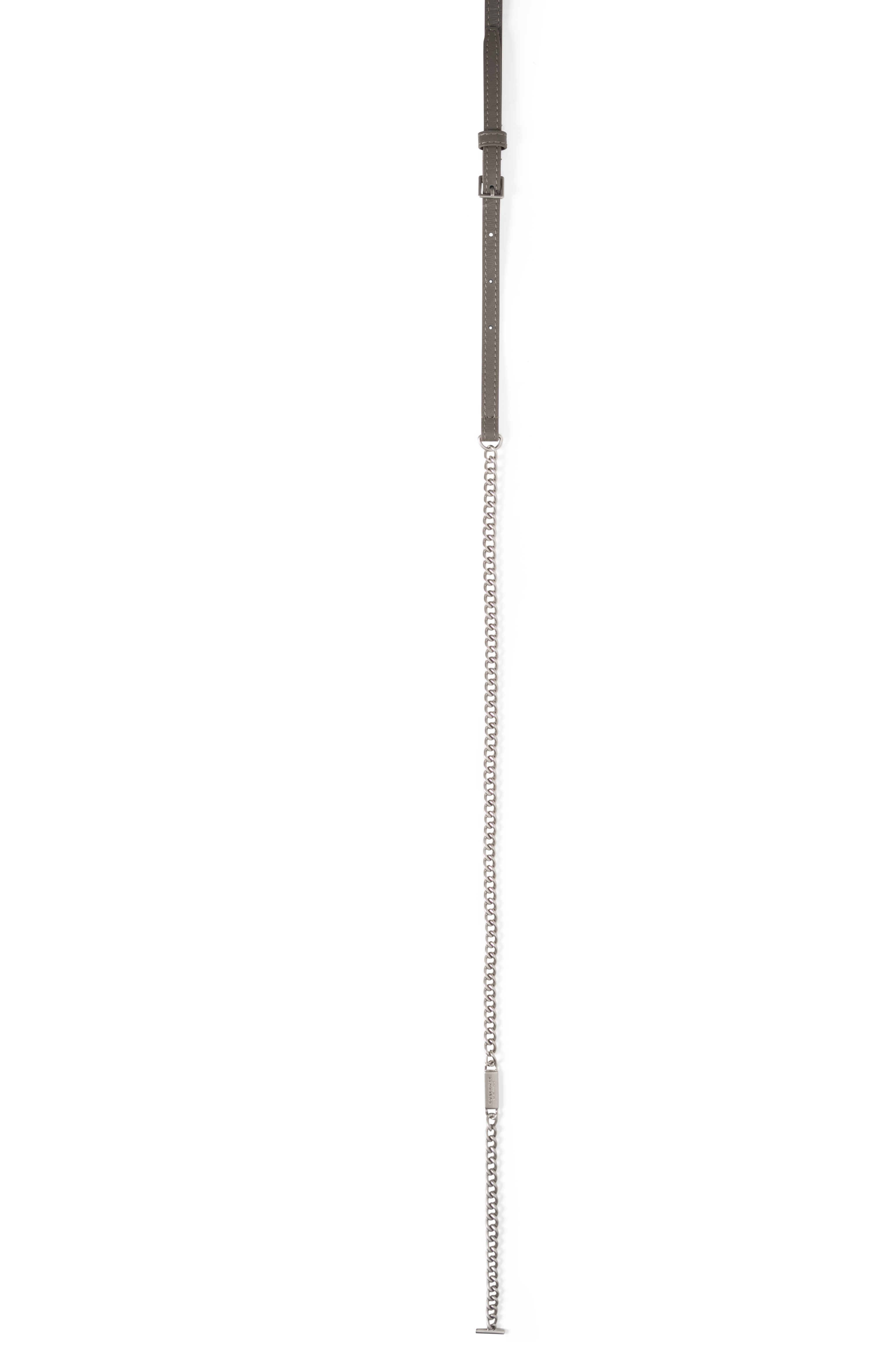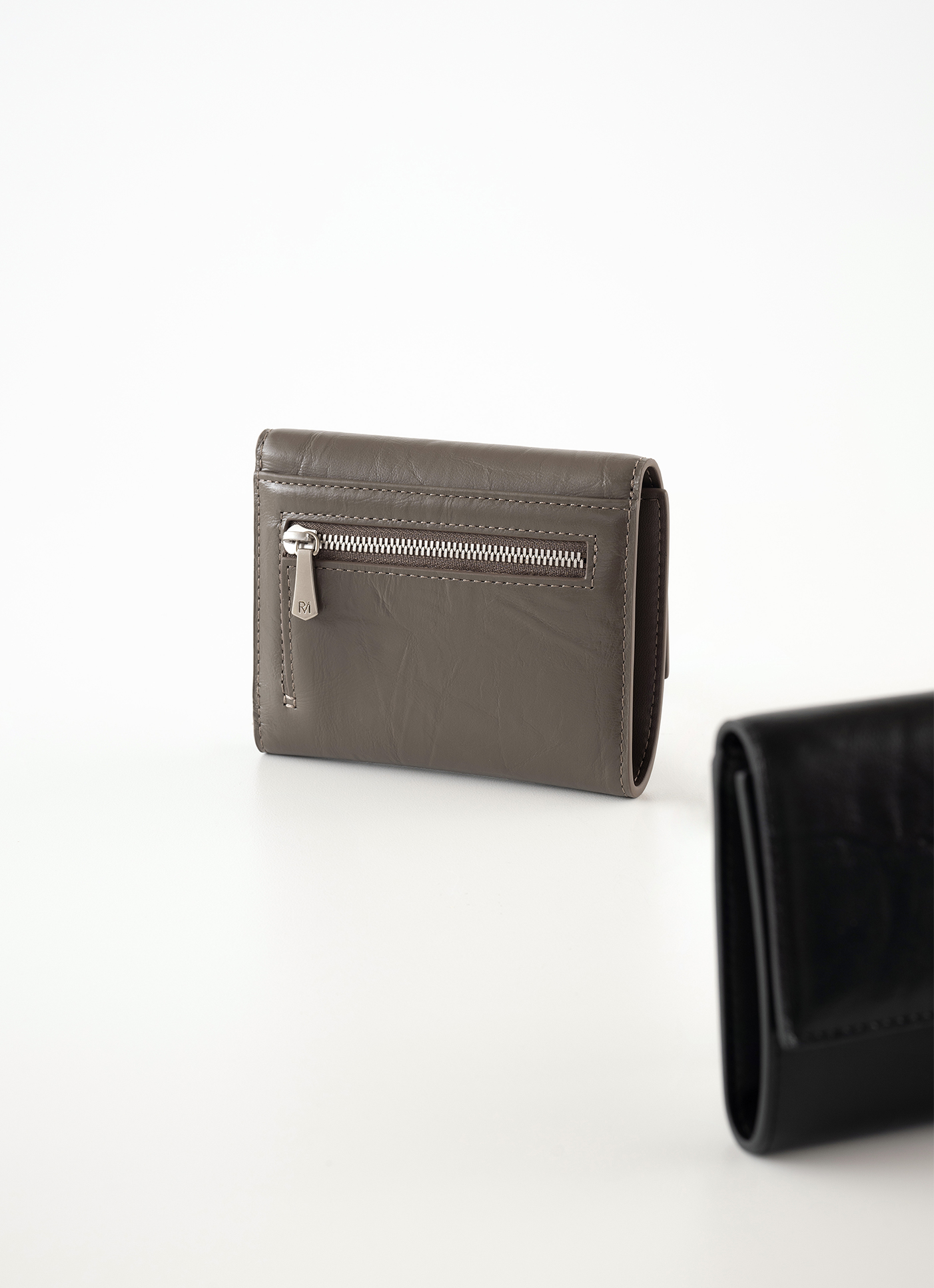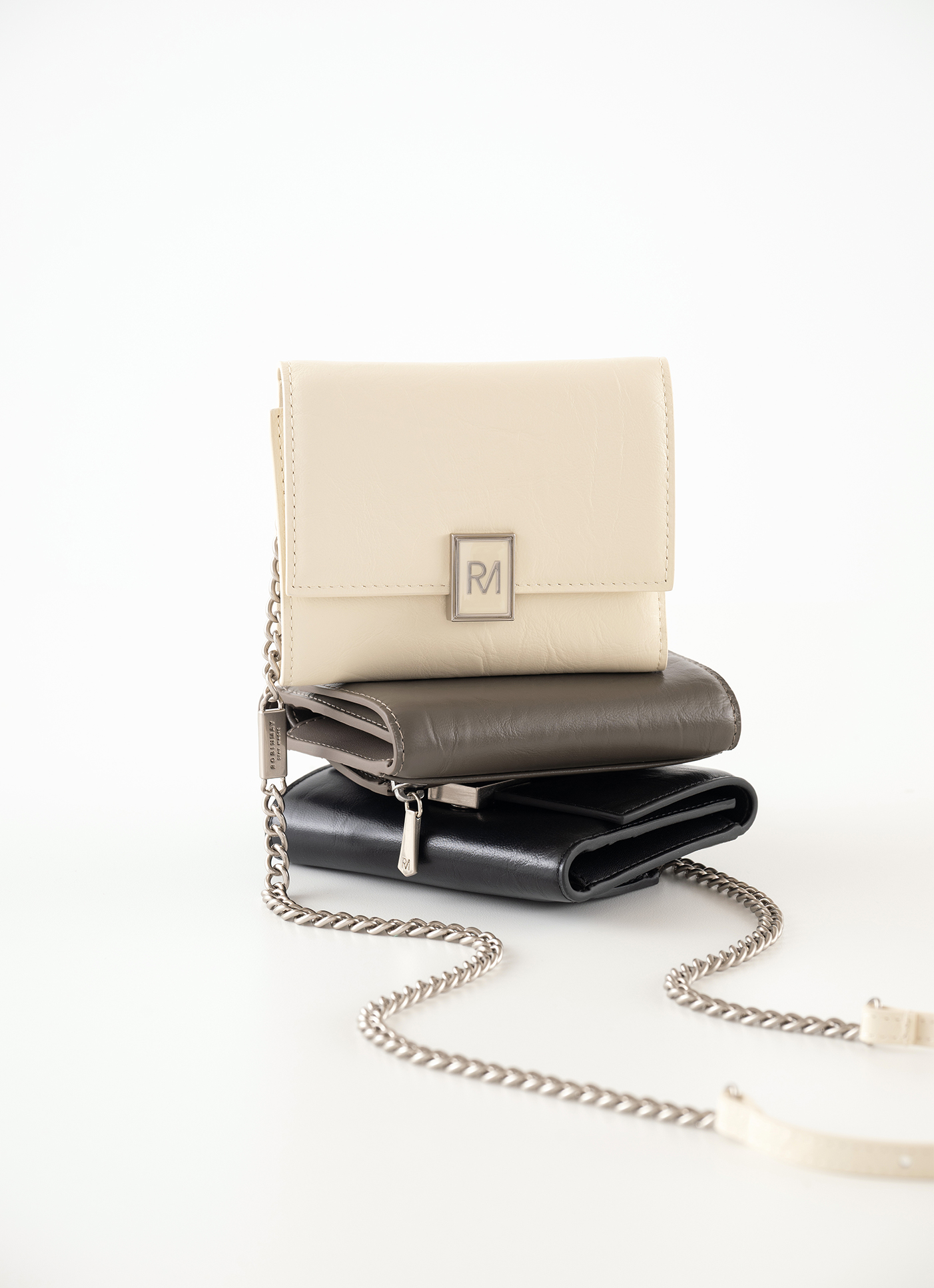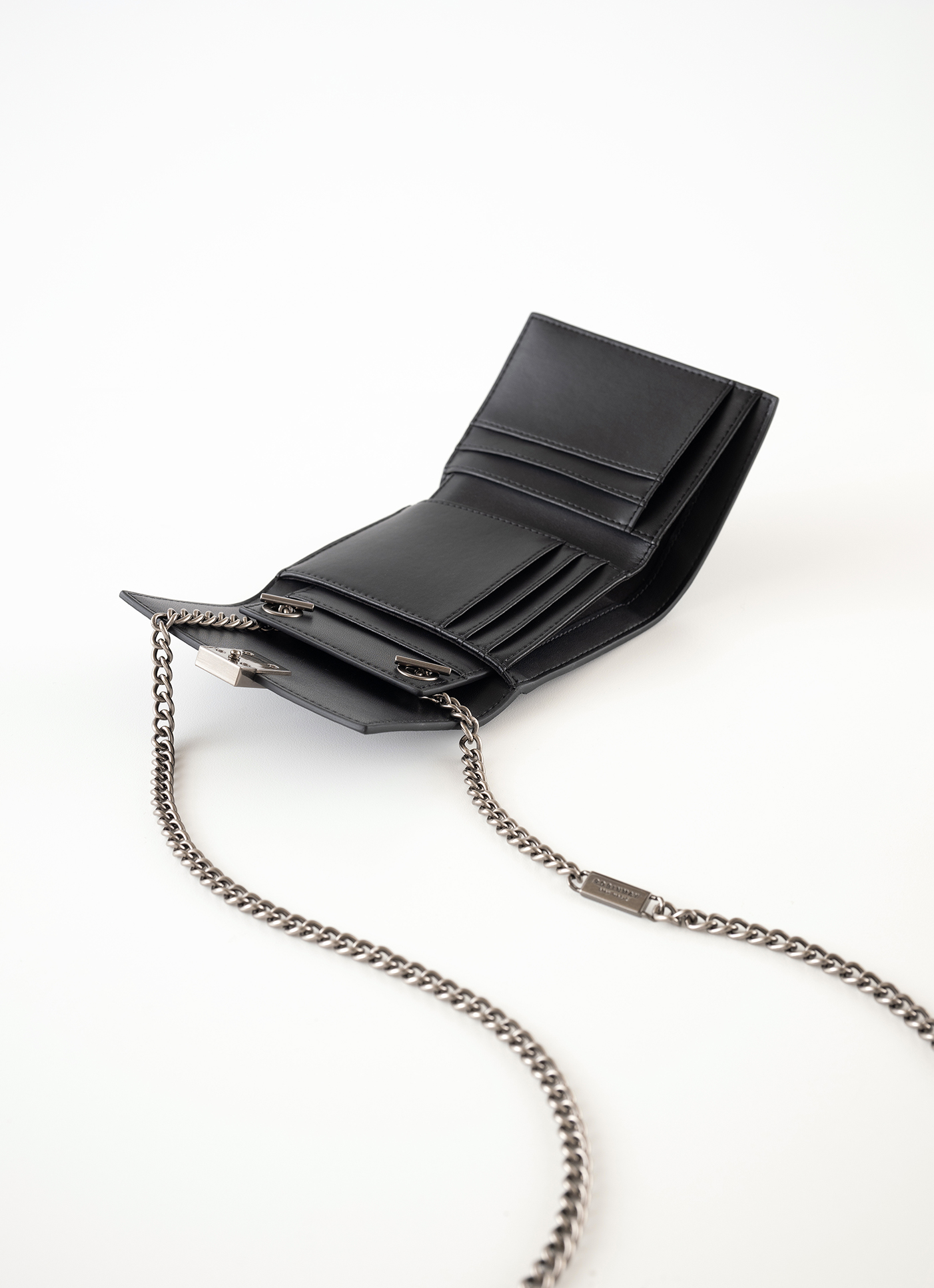 經典折疊壓扣短夾設計,適合日常使用配戴RM 金屬牌扣封口,結合時髦個性的皮革壓紋基本收納空間,票卡零錢時尚收納附金屬鏈背帶,可搭配短夾一起使用