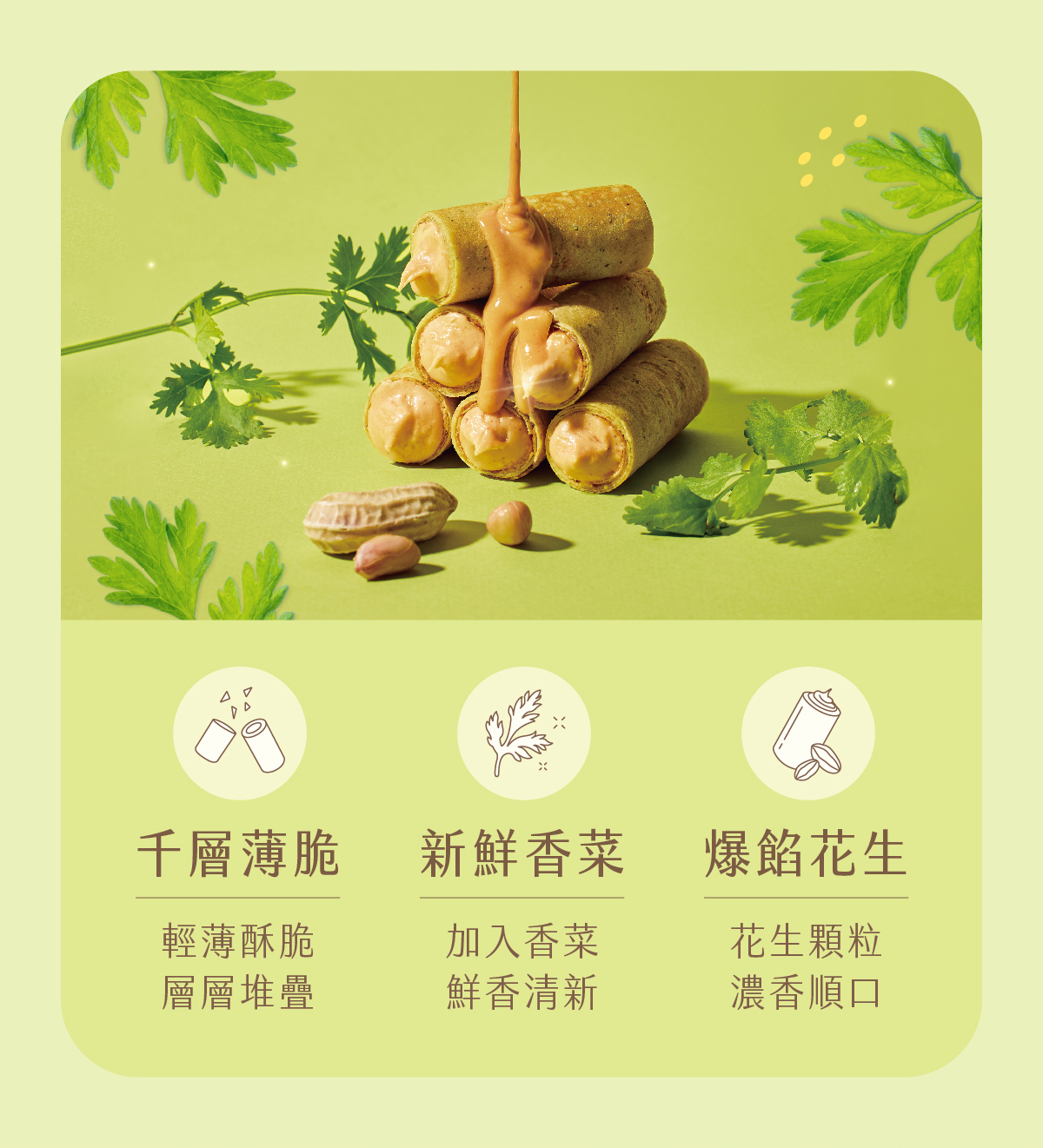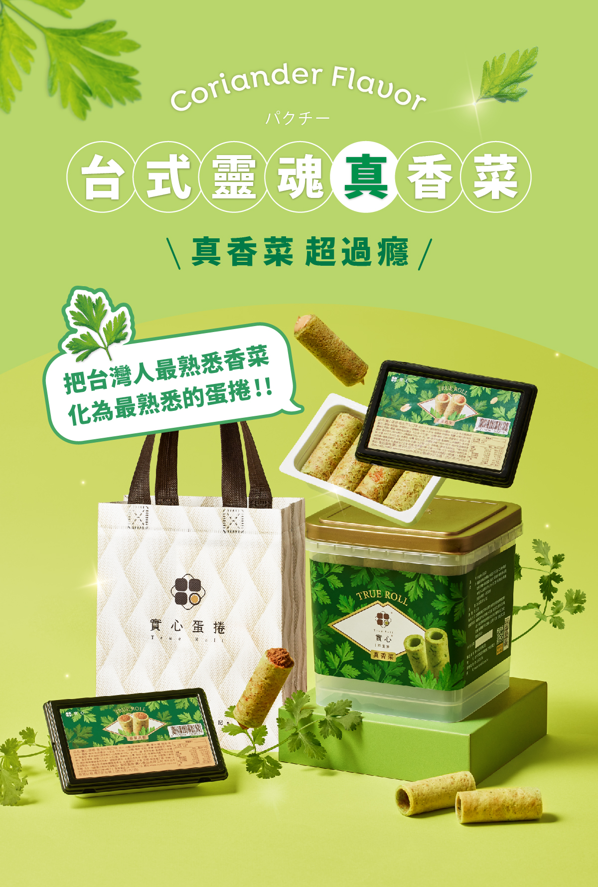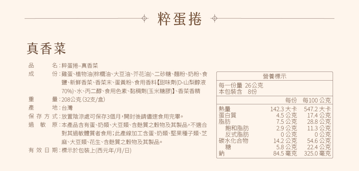 ・規格:32入粹蛋捲x1盒-真香菜+實心蛋捲x2盒(香菜花生x1+香菜肉鬆x1)+品牌小提袋(白)