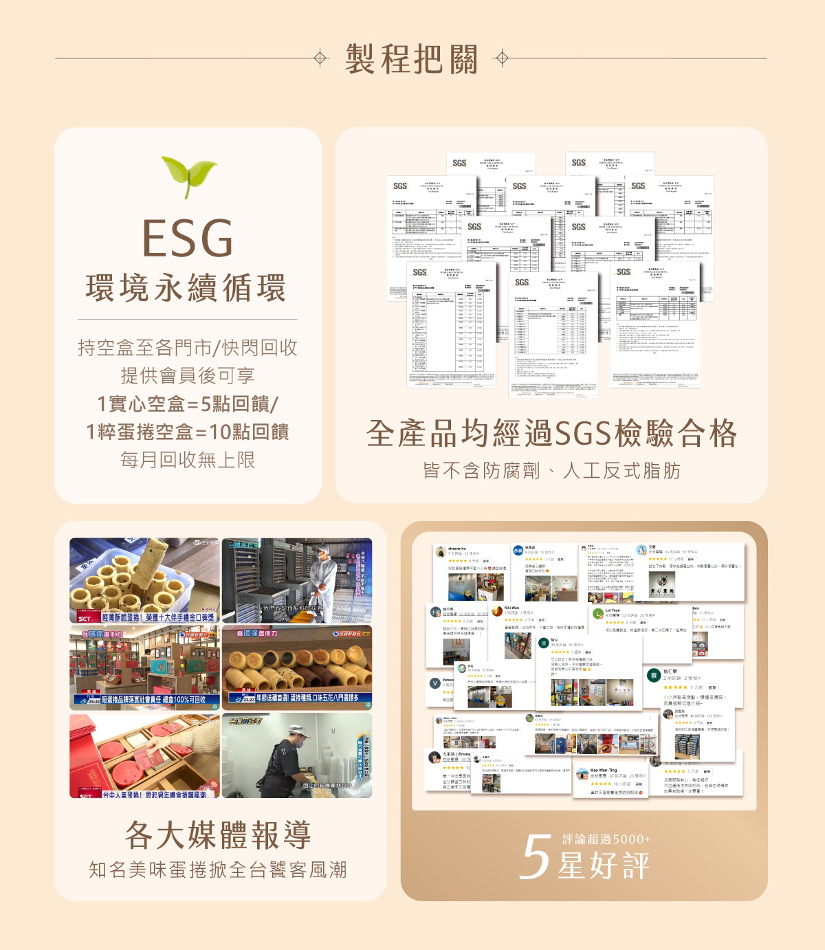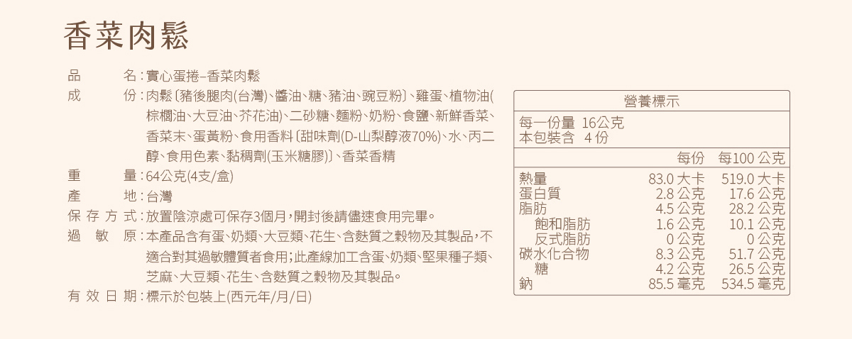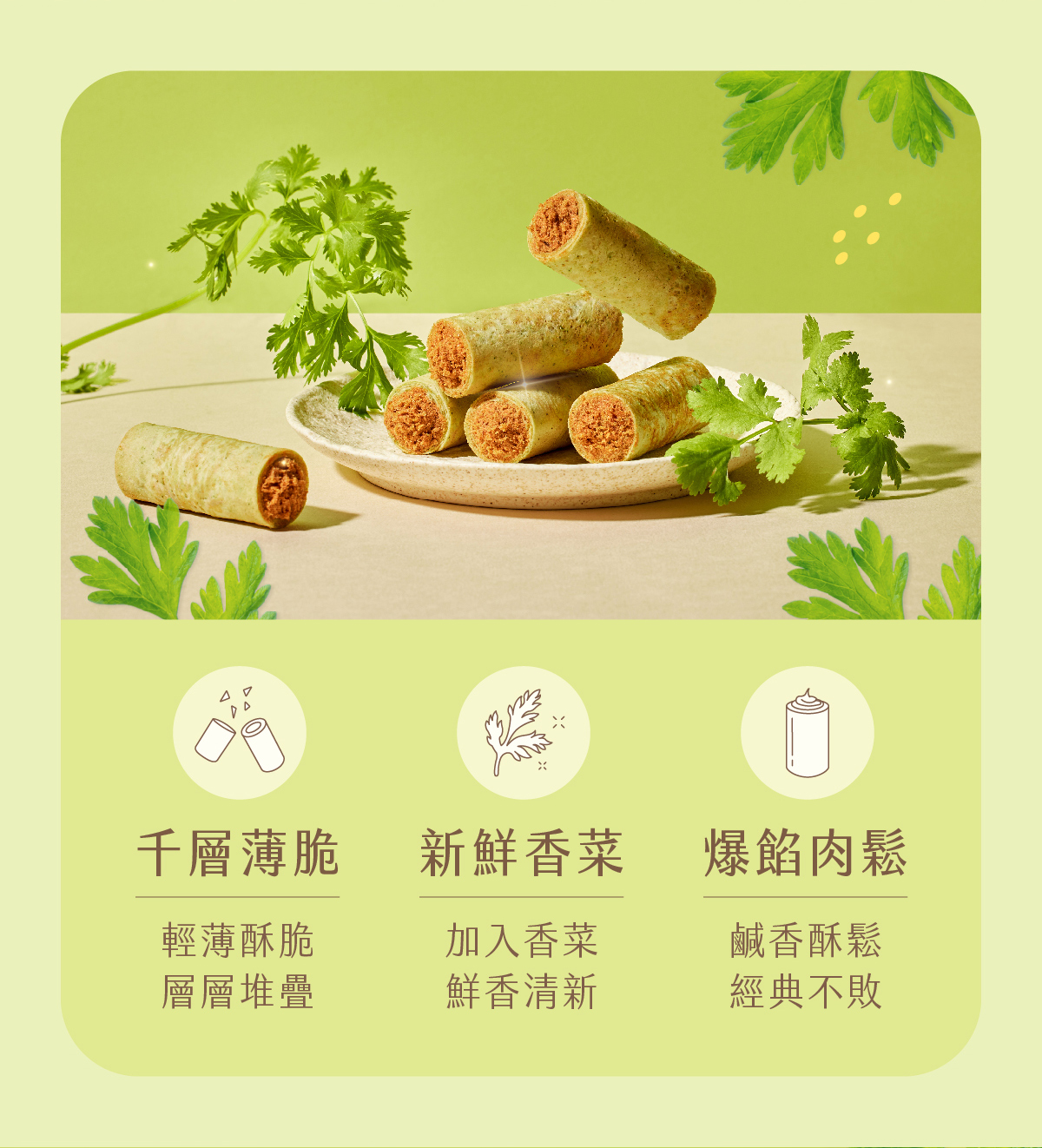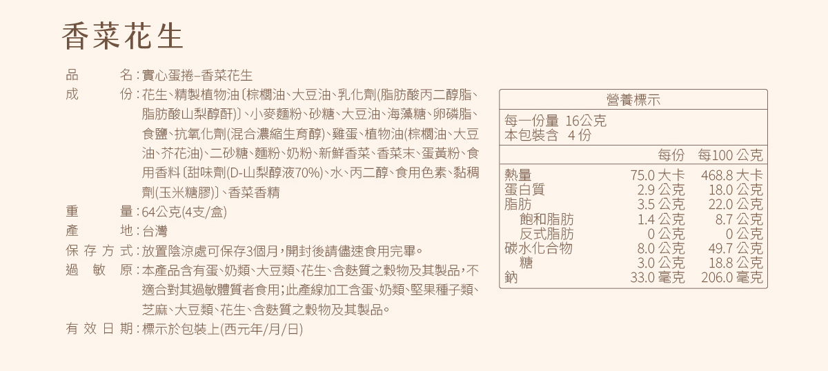 ・規格:32入粹蛋捲x1盒-真香菜+實心蛋捲x2盒(香菜花生x1+香菜肉鬆x1)+品牌小提袋(白)