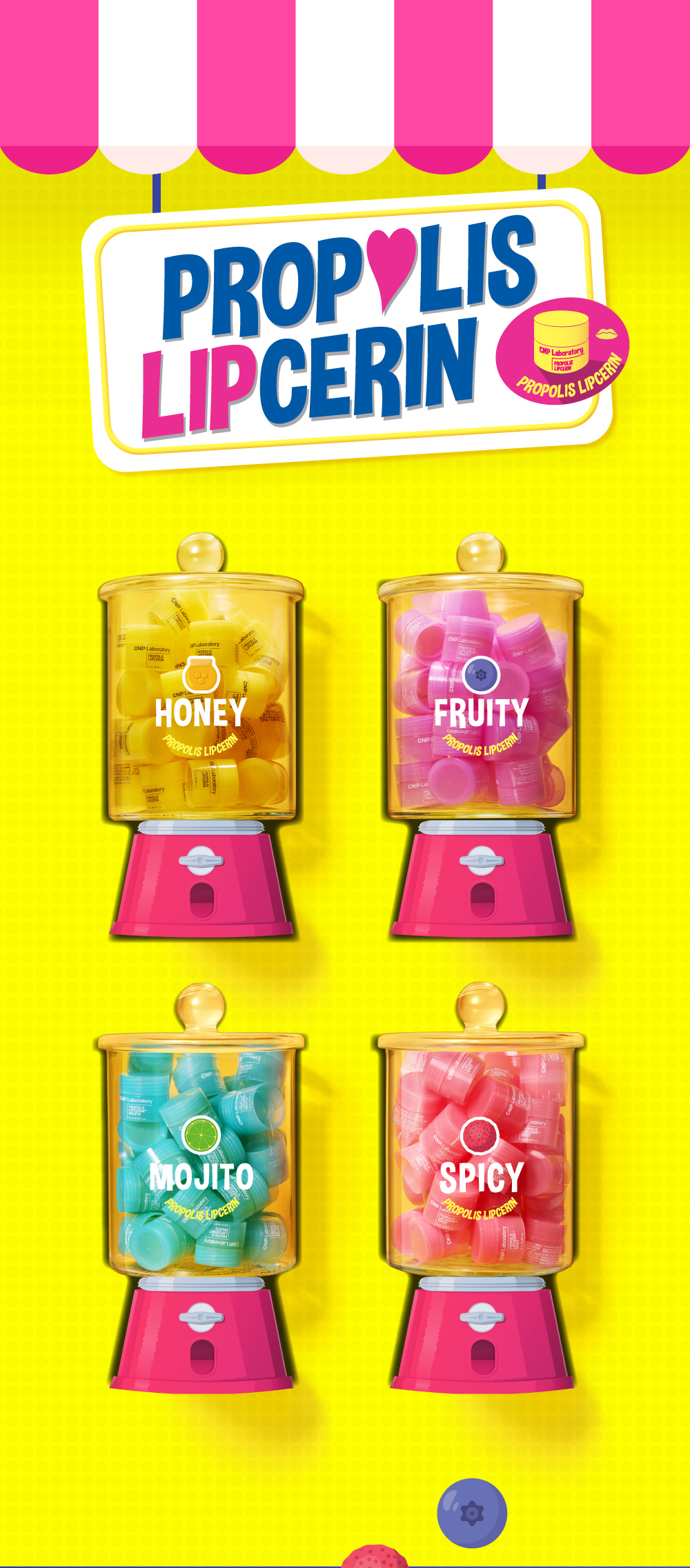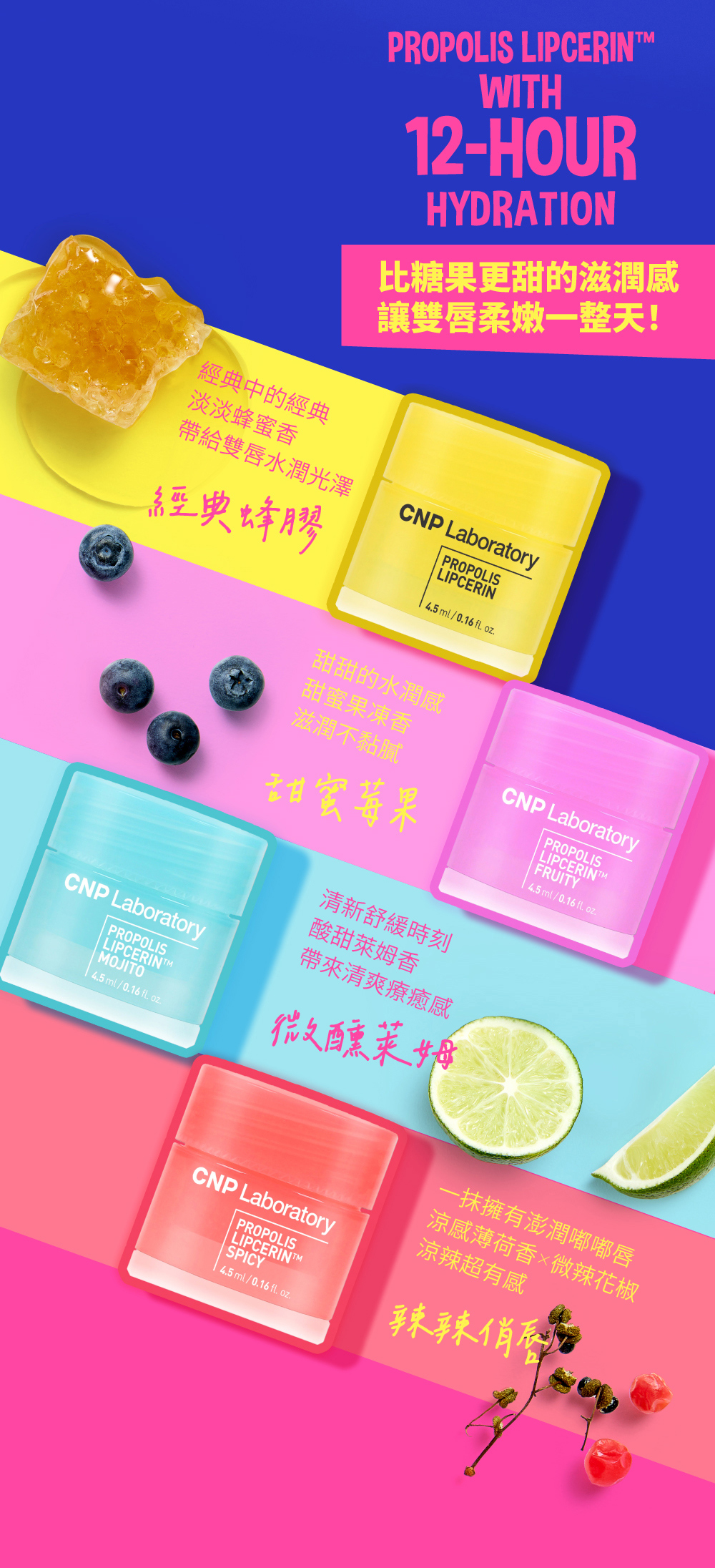 經典蜂膠:淡淡蜂蜜香;甜蜜莓果:香甜果凍香;微醺萊姆:清新萊姆香;辣辣俏唇:涼感薄荷香。