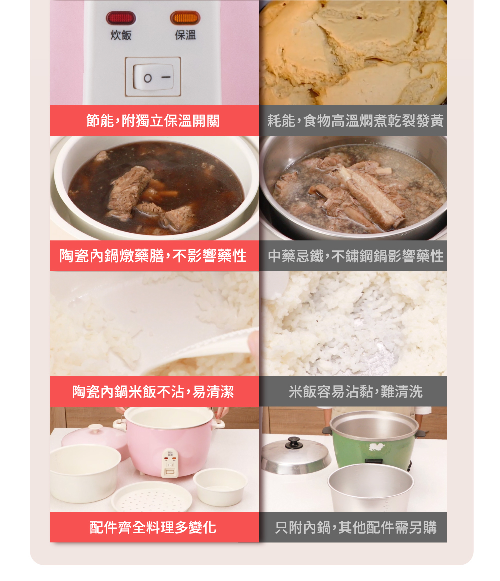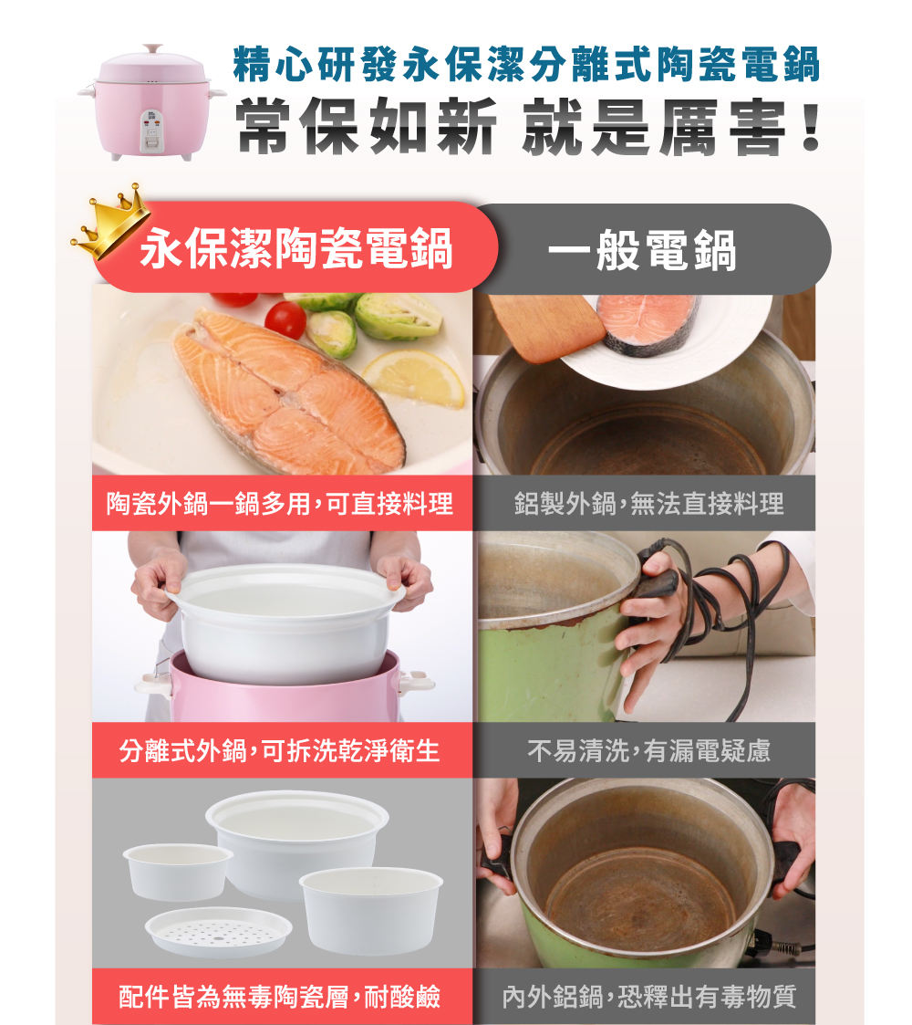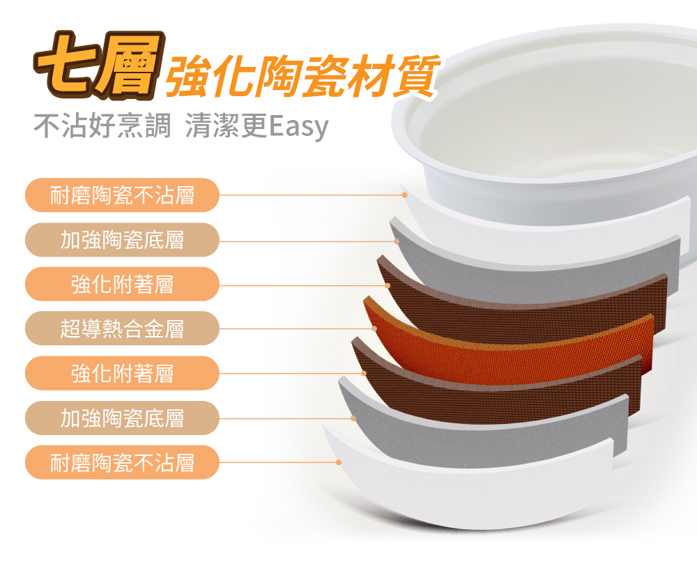 全機採TC5A高科技陶瓷工藝。提升易潔度200%,清潔更Easy。陶瓷不沾材質,烹煮無金屬味。分離式外鍋,可取出清洗不藏汙納垢。煎/煮/炒/炸/燜/蒸/燉/火鍋…OK。獨立保溫開關,隨享溫熱美食。