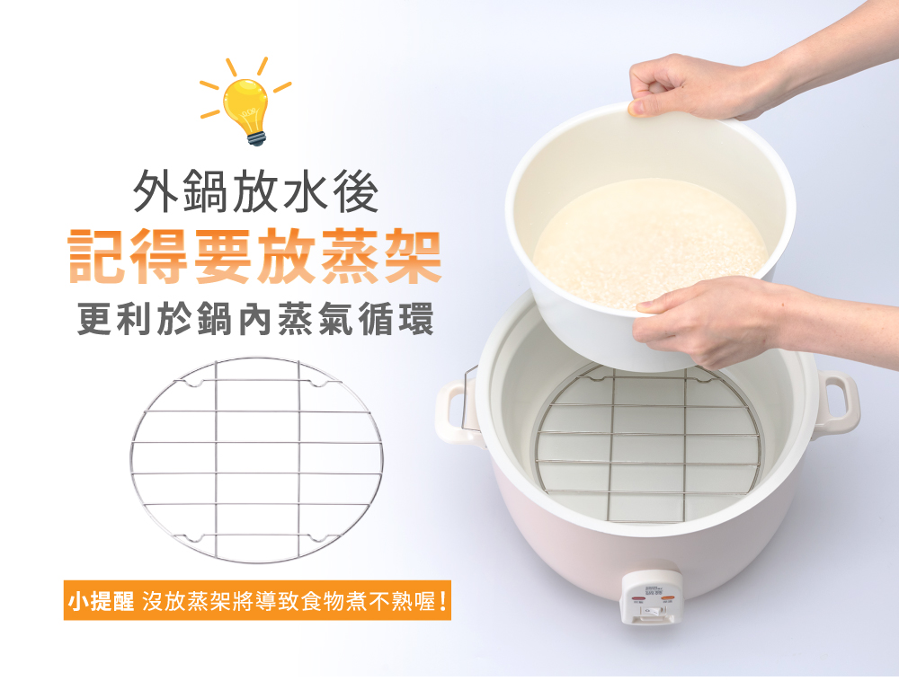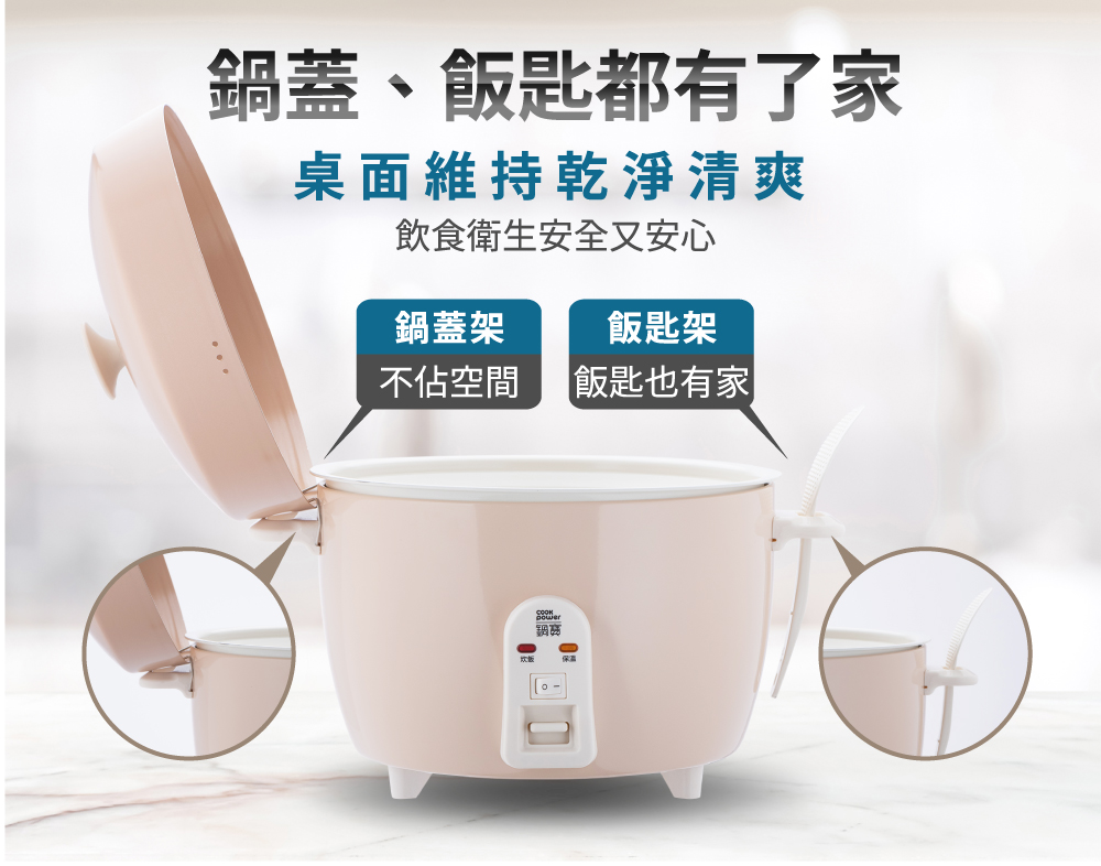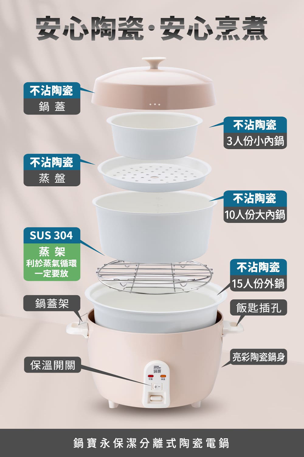 品名:【鍋寶】永保潔分離式陶瓷不沾電鍋 10人份-奶茶型號:ER-1071額定電壓/額定頻率:110V/60Hz總額定消耗電功率:炊飯700W 保溫55W材質:鍋身/冷扎鐵+陶瓷烤漆外鍋、內鍋、鍋蓋/鋁合金+不沾陶瓷層(耐熱260℃)蒸架/304不鏽鋼量米杯/PP聚丙烯(耐熱120℃)飯匙/PP聚丙烯重量:約2.8kg±5%(含外鍋)滿水容量:外鍋5.8L±5%、內鍋4L±5%有效容量:外鍋4.6L±5%、內鍋3.2L±5%商品尺寸:約長36×寬30×高29cm±5%數量:乙組入附件:10人外鍋×1、內鍋×1、蒸架×1、飯匙×1、量米杯×1產地:台灣