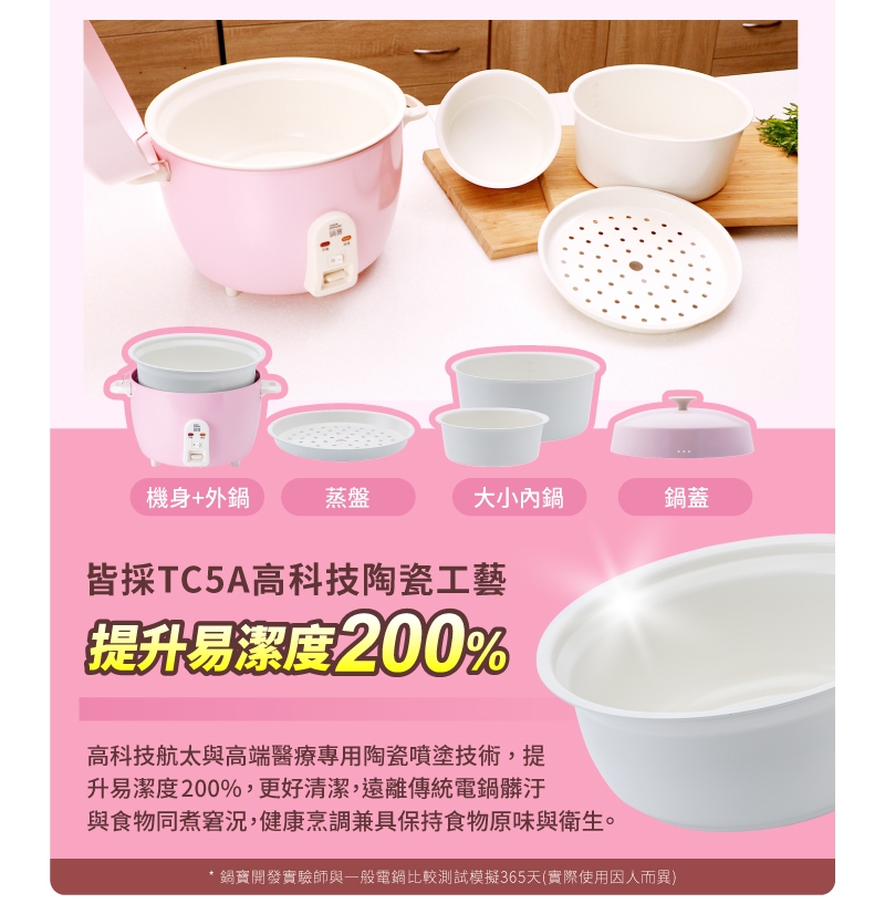 全機採TC5A高科技陶瓷工藝。提升易潔度200%,清潔更Easy。陶瓷不沾材質,烹煮無金屬味。分離式外鍋,可取出清洗不藏汙納垢。煎/煮/炒/炸/燜/蒸/燉/火鍋…OK。獨立保溫開關,隨享溫熱美食。