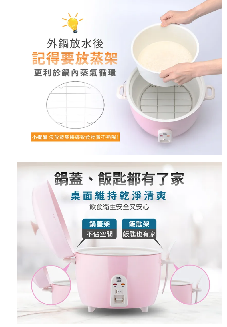 附件:10人外鍋×1、內鍋×1、蒸架×1、飯匙×1、量米杯×1