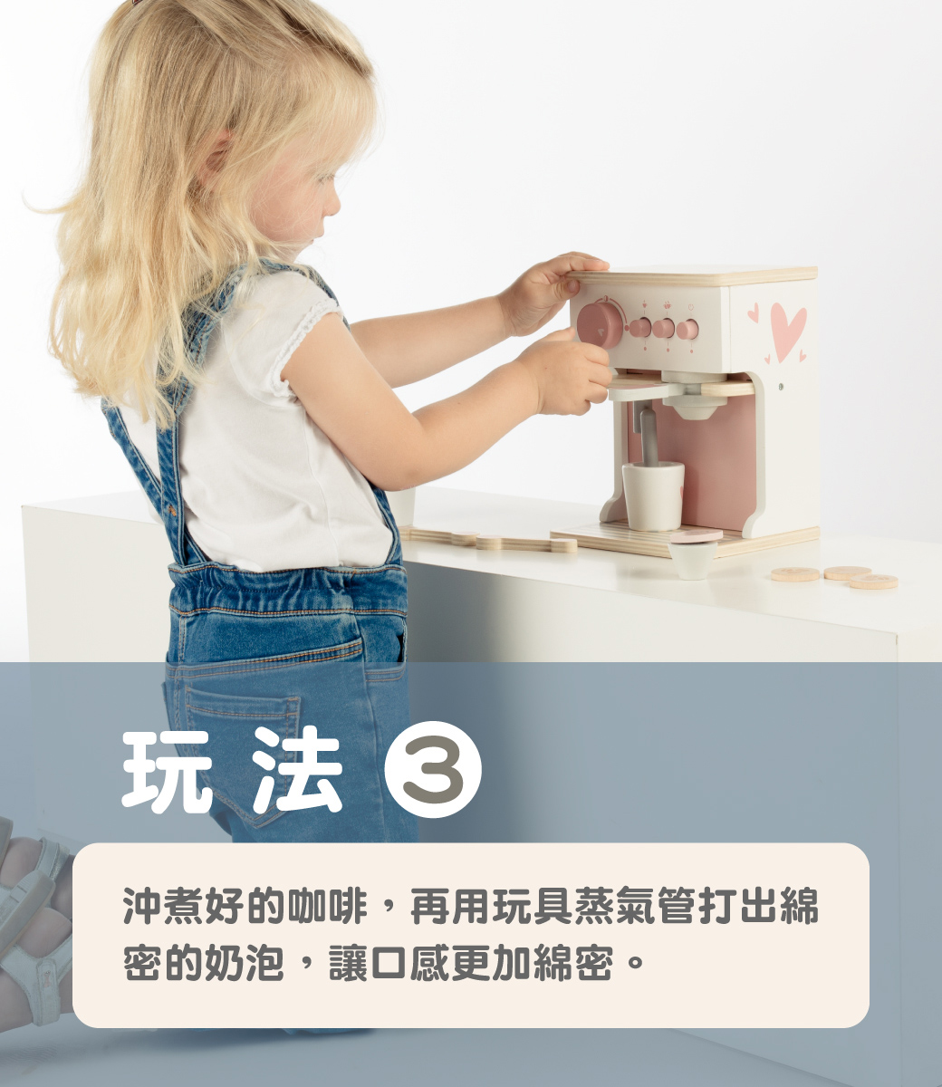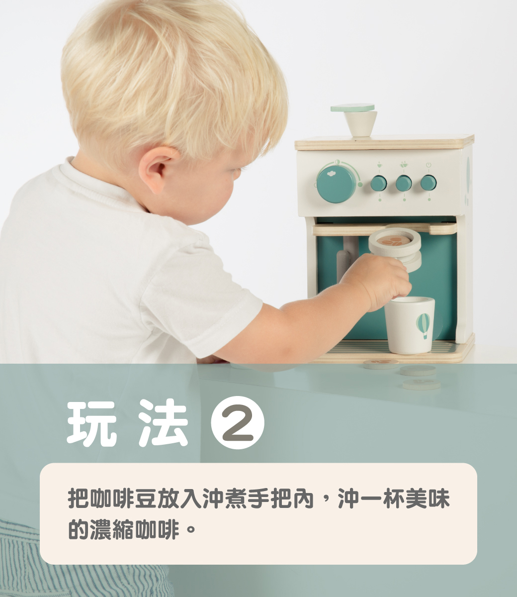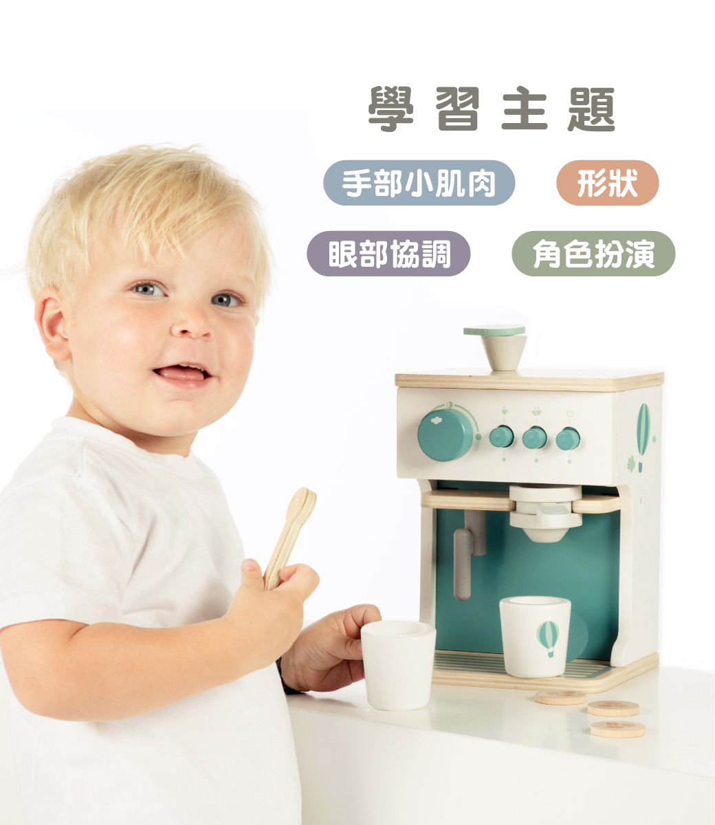 咖啡機商品特色:●坐下來好好享受,用濃縮咖啡機製作的美味咖啡●濃縮咖啡機配有 2 個杯子、2個湯匙、一個鮮奶杯和 3 款咖啡豆●將咖啡機轉動開關後,再選擇沖調的杯數●把咖啡豆放入沖煮手把內,沖一杯美味的濃縮咖啡●沖煮好的咖啡,再用蒸氣管打出綿密的奶泡●採用FSC™認證木質製成,外觀顏色,使用兒童友善的水性顏料●學習主題:眼部協調/手部小肌肉/形狀/角色扮演