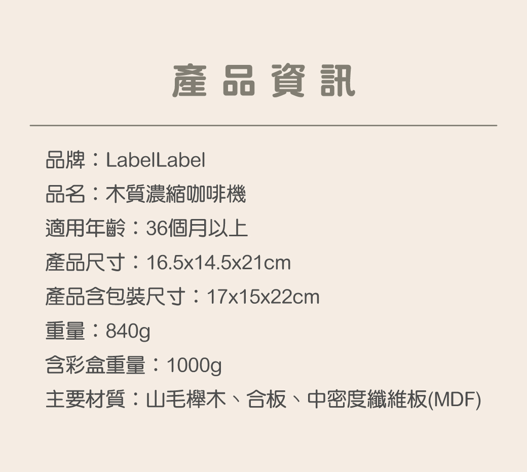 咖啡機商品規格:品牌:LabelLabel品名:木質濃縮咖啡機適用年齡:36個月以上產品尺寸:16.5x14.5x21cm產品含包裝尺寸:17x15x22cm重量:840g含彩盒重量:1000g主要材質:山毛櫸木、合板、中密度纖維板(MDF)
