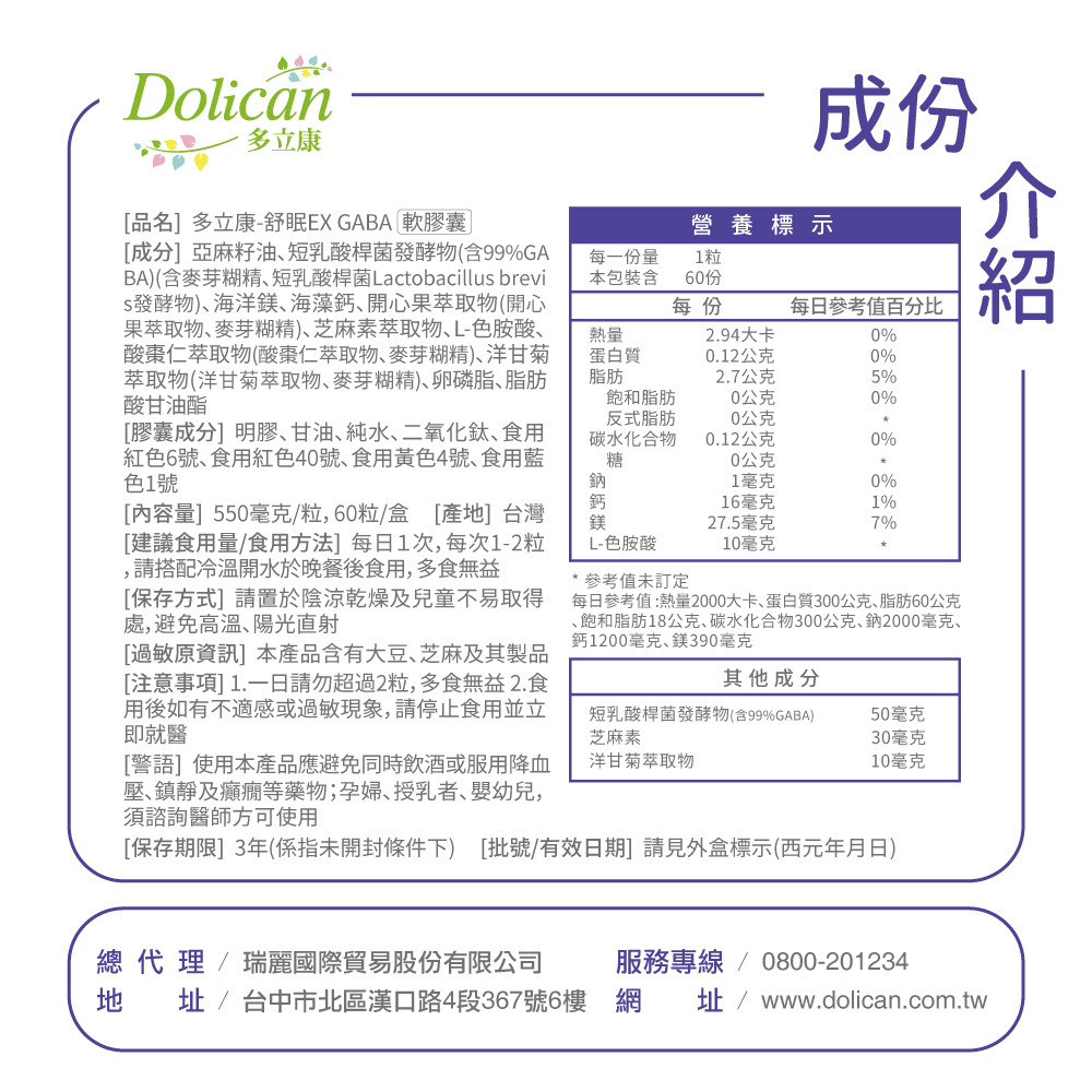 商品內容 名稱:多立康-舒眠EX GABA 軟膠囊 60粒/瓶