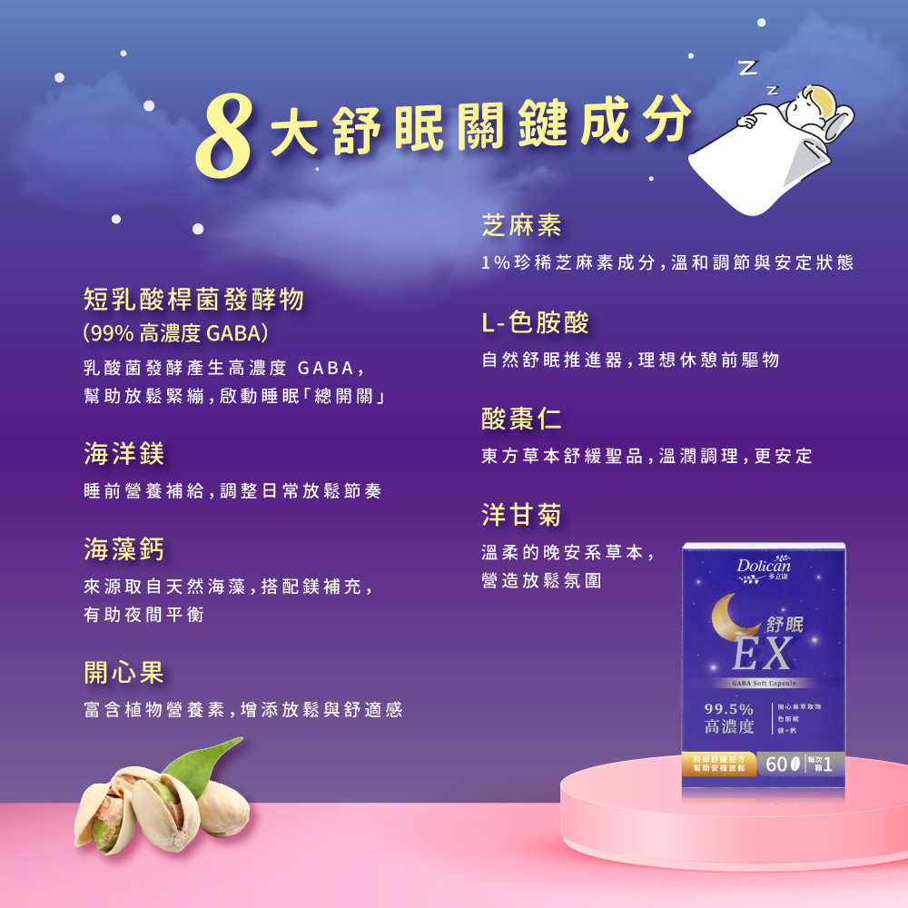 成分:亞麻籽油、短乳酸桿菌發酵物(含99%GABA)(含麥芽糊精、短乳酸桿菌Lactobacillus brevis發酵物)、海洋鎂、海藻鈣、開心果萃取物(開心果萃取物、麥芽糊精)、芝麻物萃取物、L-色胺酸、酸棗仁萃取物(酸棗仁萃取物、麥芽糊精)、洋甘菊萃取物(洋甘菊萃取物、麥芽糊精)、卵磷脂、脂肪酸甘油酯。明膠、甘油、純水、二氧化鈦、食用紅色6號、食用紅色40號、食用黃色4號、食用藍色1號