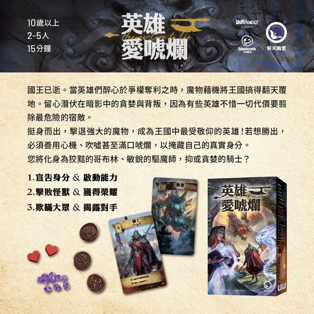 國王已逝。當英雄們醉心於爭權奪利之時,魔物藉機將王國搞得翻天覆地。留心潛伏在暗影中的貪婪與背叛,因為有些英雄不惜一切代價要翦除最危險的宿敵。挺身而出,擊退強大的魔物,成為王國中最受敬仰的英雄!若想勝出,必須善用心機、吹噓甚至滿口唬爛,以掩藏自己的真實身分。您將化身為狡黠的哥布林、敏銳的驅魔師,抑或貪婪的騎士?