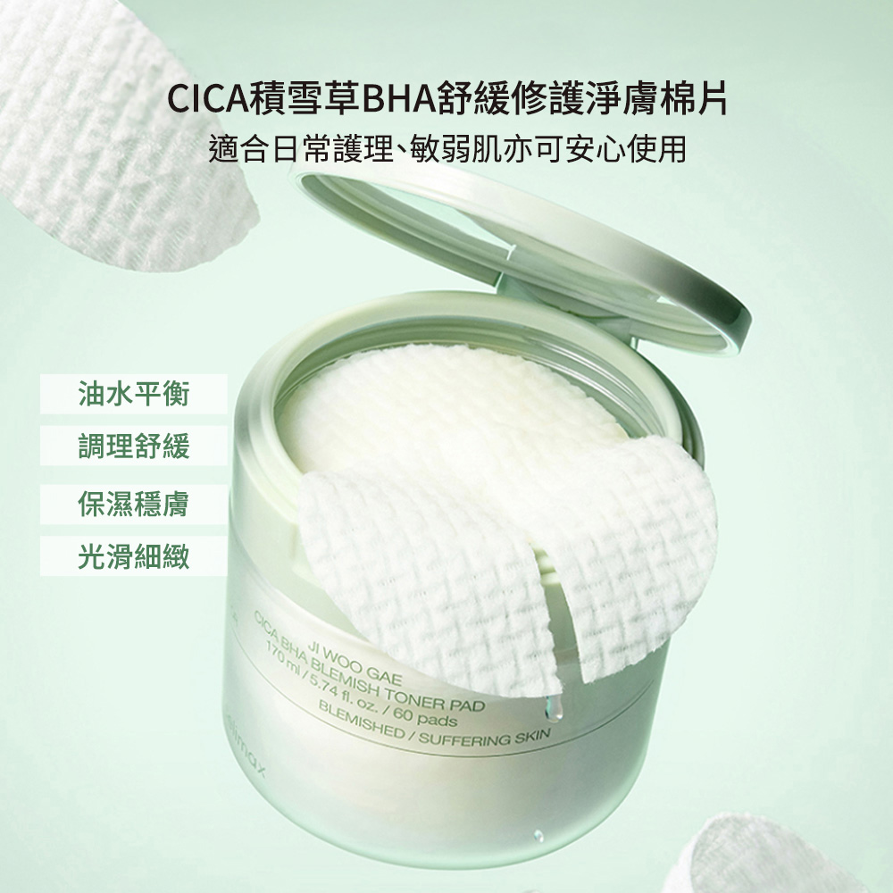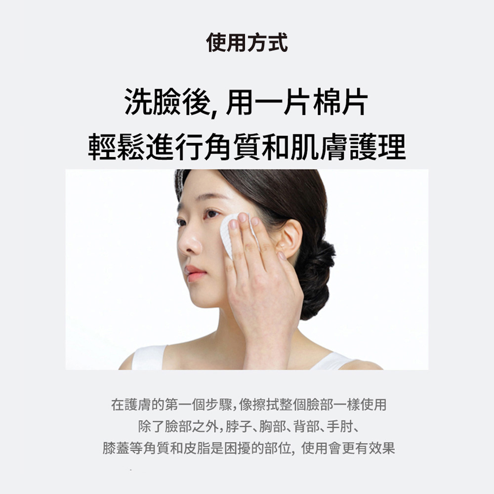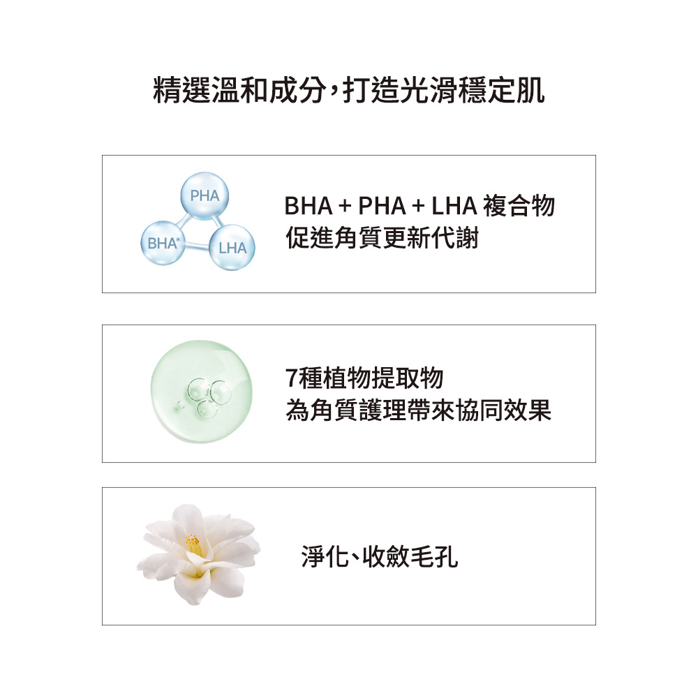▪️BHA + PHA + LHA 複合物,溫和去除老廢角質,平滑肌膚紋理,無刺激或乾燥感▪️七氯酸複合物搭配多種植物萃取,有助於平衡油水與舒緩肌膚不適▪️含積雪草萃取,溫和呵護痘痘肌與敏感肌,適合日常護理▪️收斂毛孔:山茶花萃取幫助維持毛孔緊緻,改善肌膚紋理▪️使用方式:於基礎保養第一步,輕擦全臉,擦拭後拍打幫助後續化妝水吸收;可加強局部護理或作為DIY面膜使用,停留約 3 分鐘▪️規格:60pcs/170ml