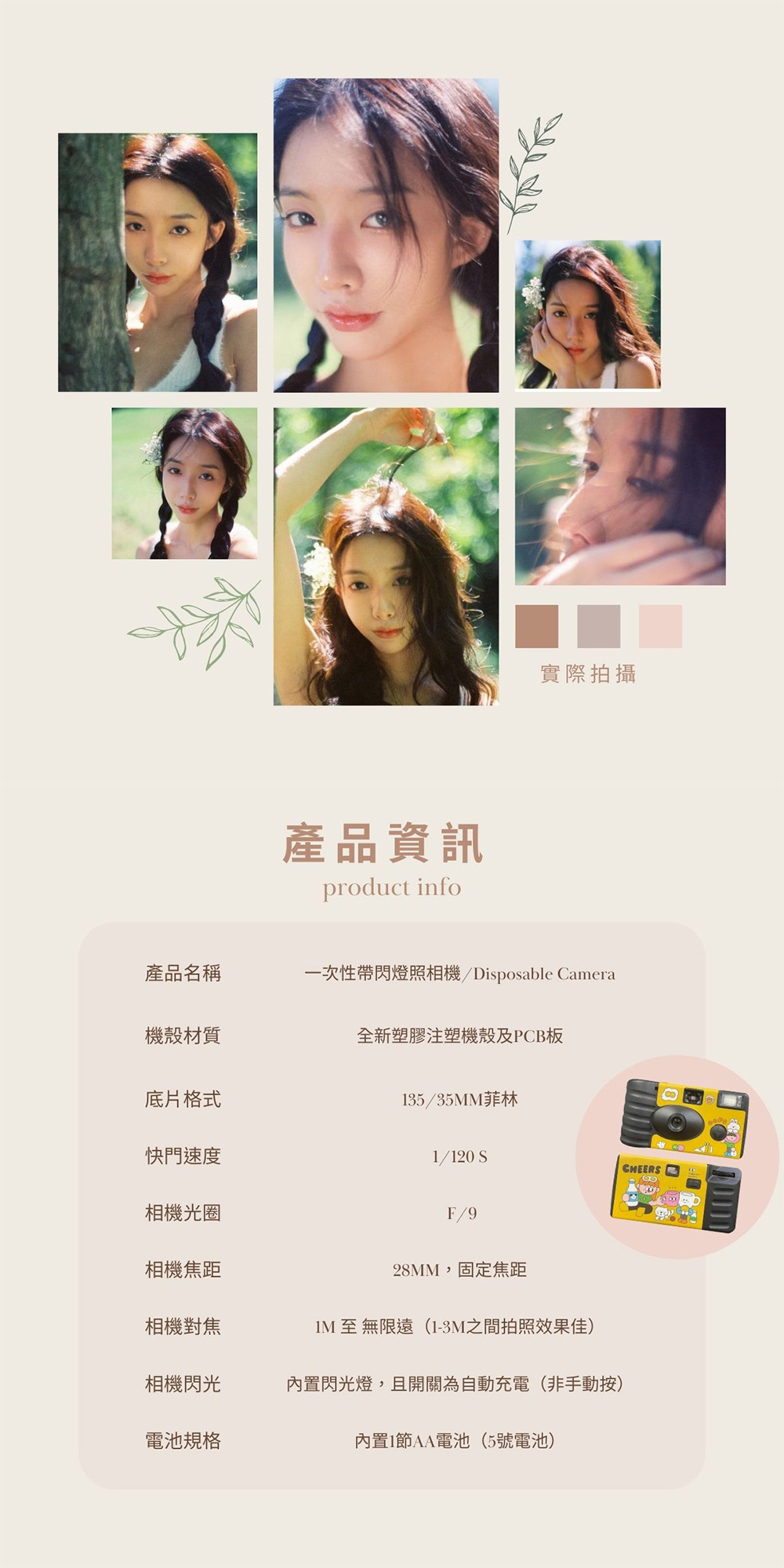 【商品規格】機殼材質:全新塑膠注塑機殼及PCB板底片格式:135/35mm膠卷快門速度:1/120s鏡頭焦距:28mm,固定焦距光 圈:F/9對 焦:1m 至無限遠 (1-3m之間拍照效果佳)閃 光:內置閃光燈,且開關為自動充電 (非手動按)拍攝張數:18張彩色膠捲電池規格:內置1節AA電池 (5號電池)
