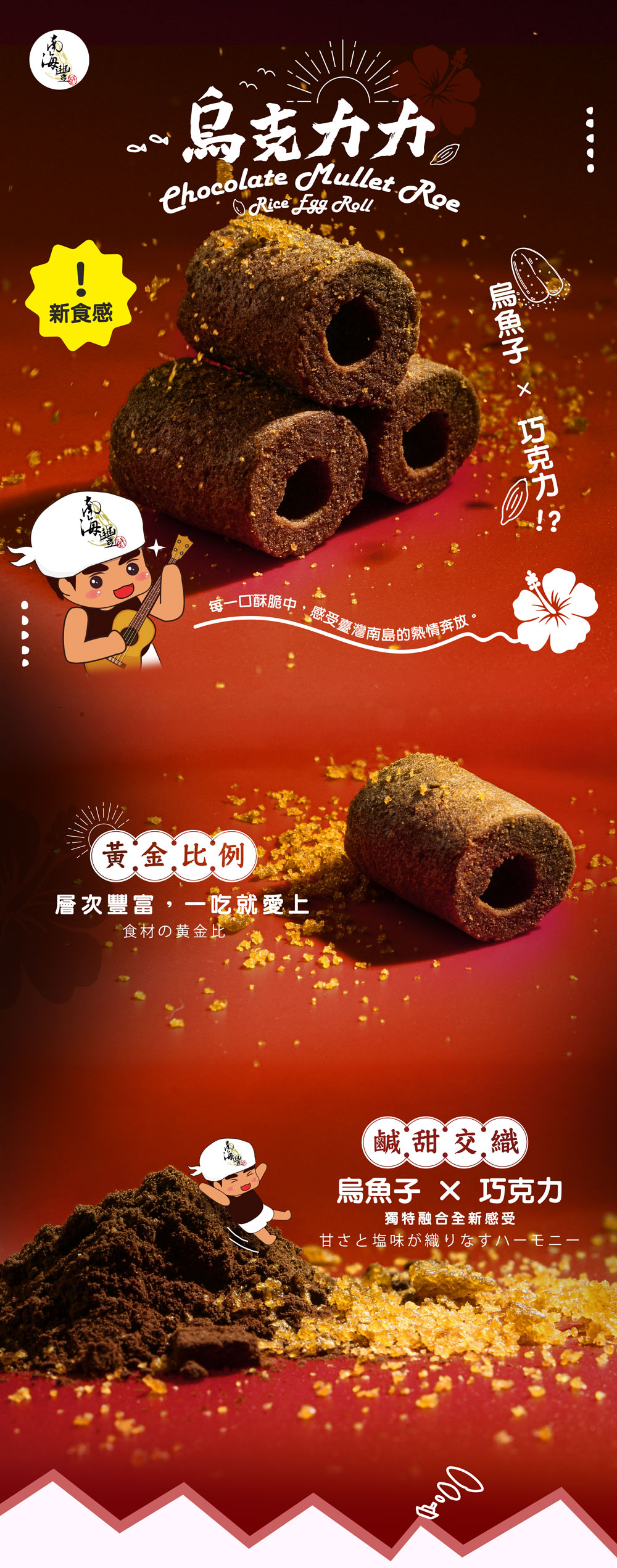 精選臺灣南部海域的烏魚子,搭配來自熱帶的巧克力,名稱巧妙融合「烏魚子」與「巧克力」,以諧音呼應海洋南島風情的烏克麗麗,希望每一位品嚐的人,都能感受到這份來自南國的熱情與創意。