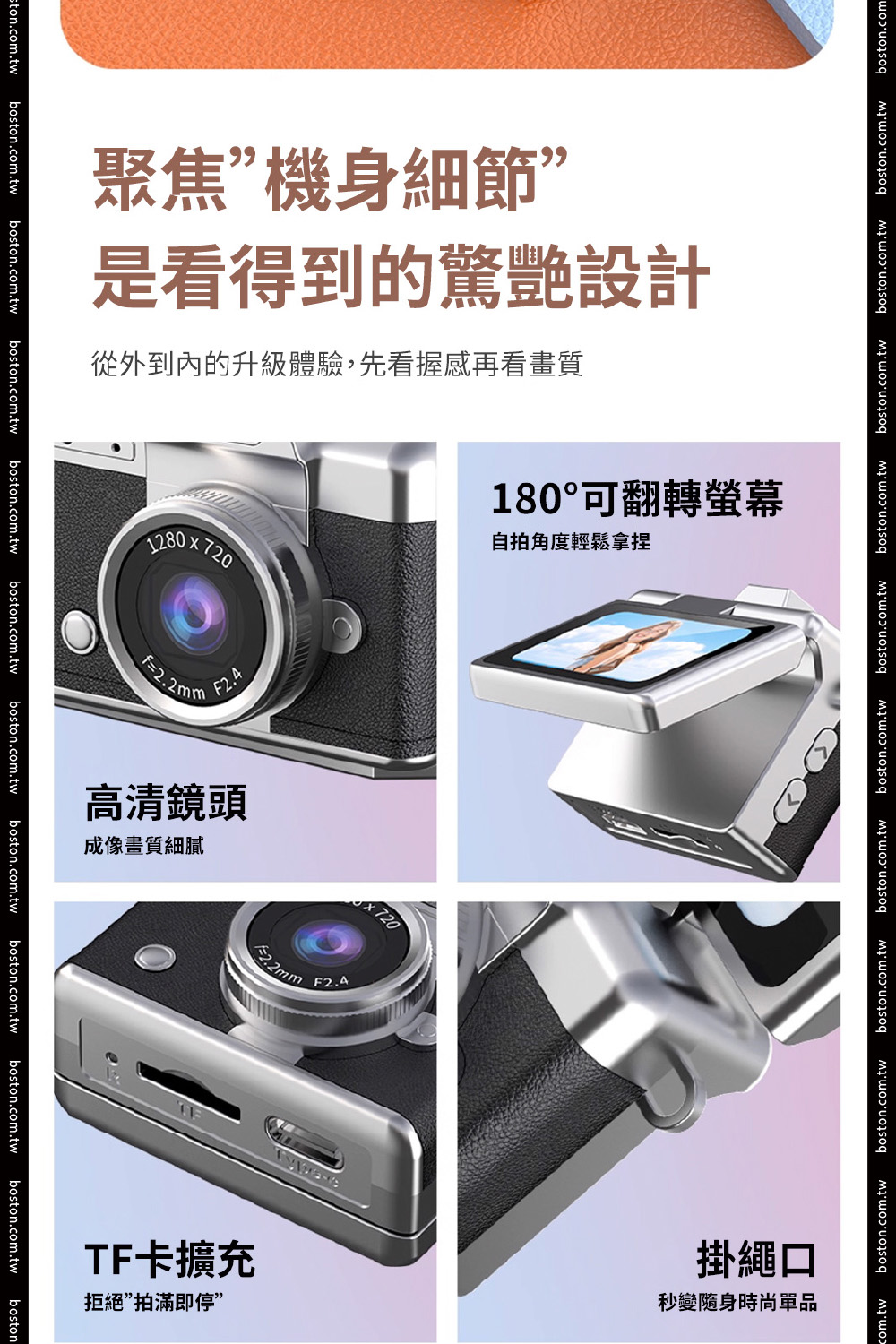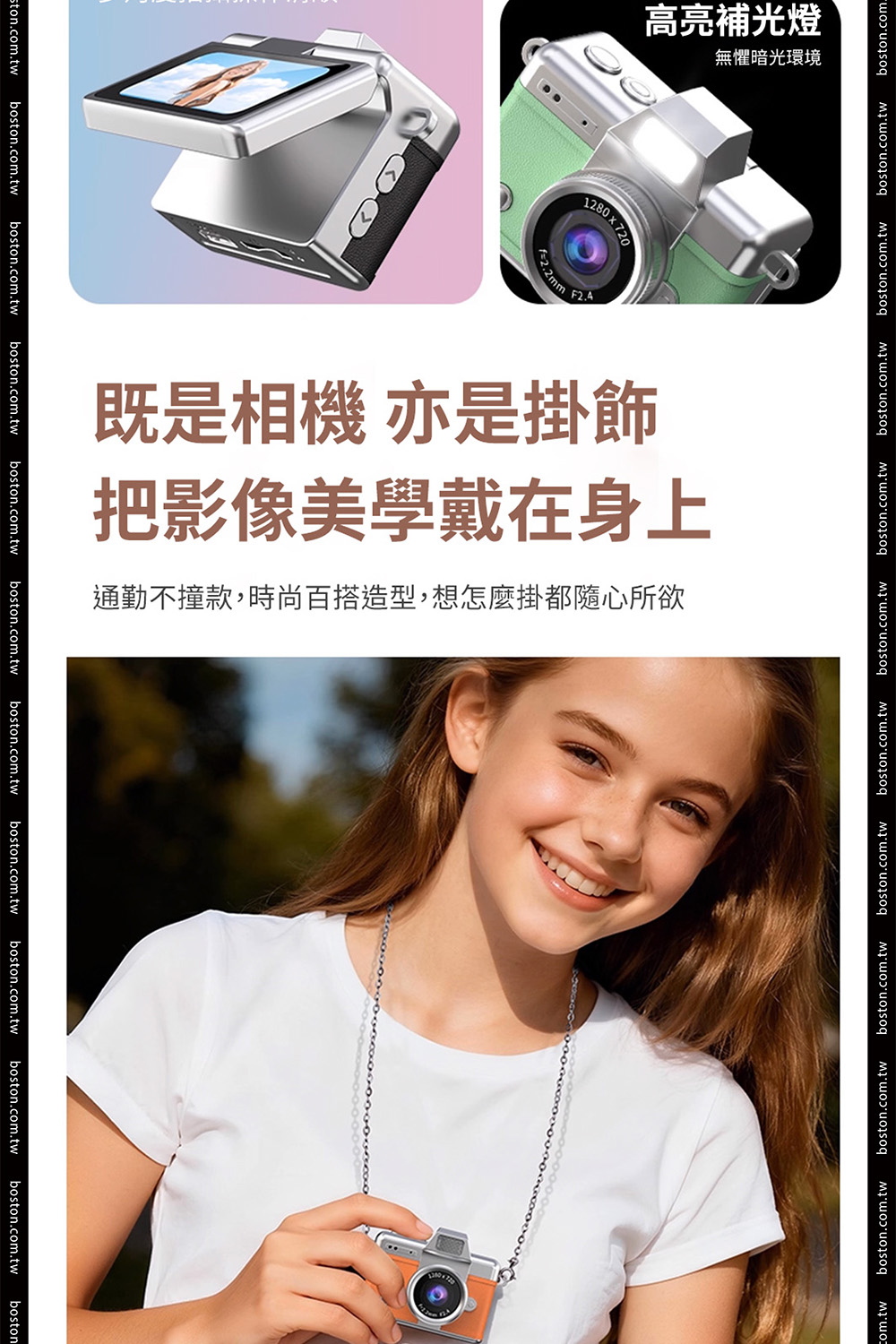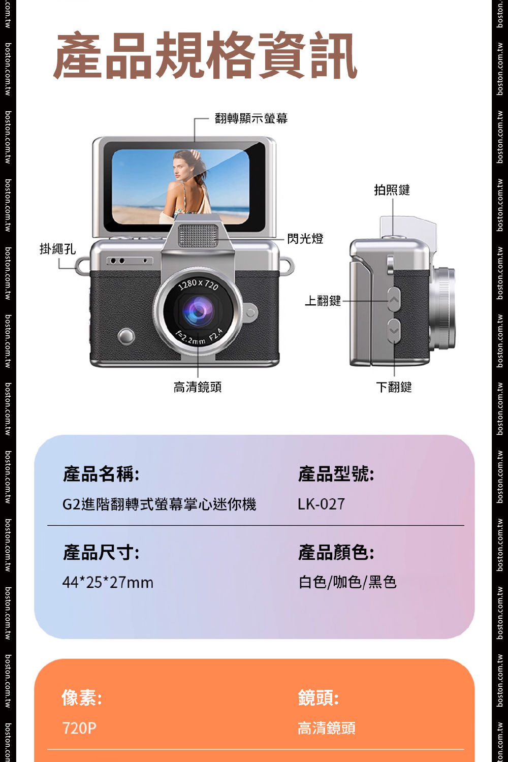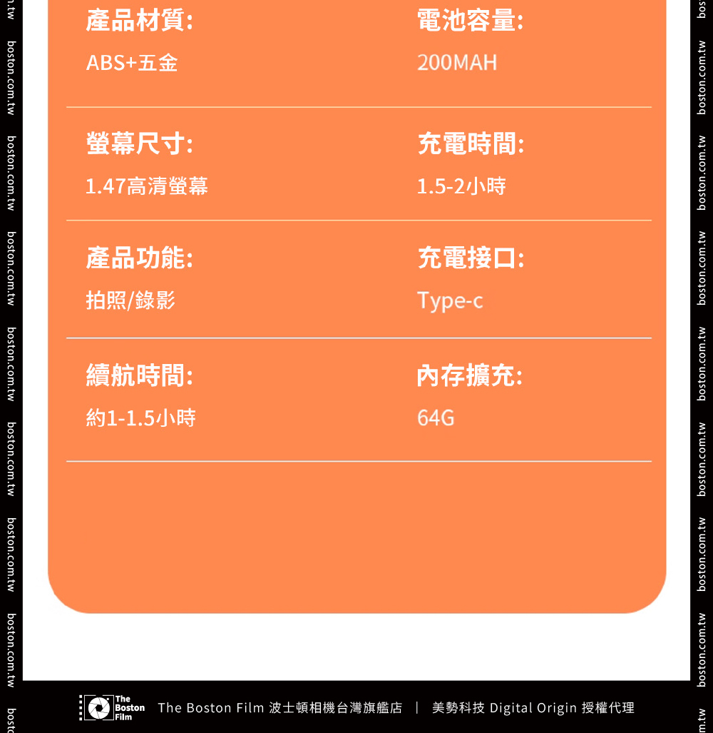 【商品規格】• 顯示螢幕:1.47吋高清顯示螢幕• 像素:720P• 電池:200mAh• 分辨率:720P• 影片格式:AVI• 充電時間:約1.5-2小時• 續航時間:約2小時• 儲存容量:支援64G• 拍照模式電流:230mA• 開機模式電流:200mA• 攝影模式電流:240mA• 關機模式電流:23µA• 螢幕休息充電模式電流:300mA• 電壓:3.7v• 尺寸:4.4 * 2.5 * 2.7cm• 材質:ABS+五金