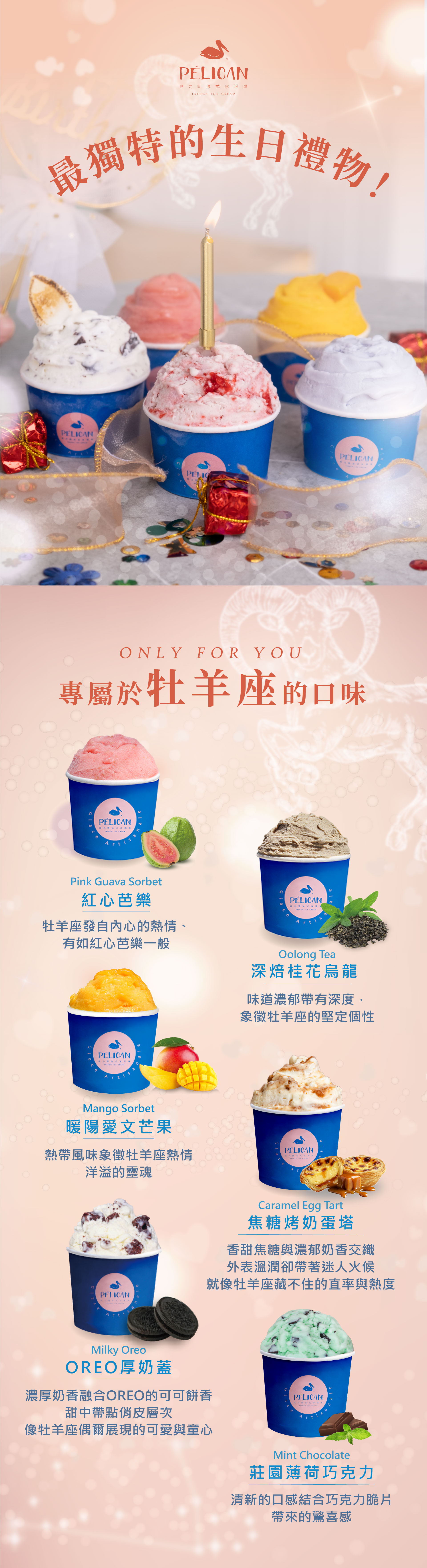 熱情、衝勁十足、喜歡新鮮刺激事物的牡羊座適合帶有濃郁風味、強烈對比或充滿創意的冰淇淋口味。此組合包含六種為牡羊座量身定做的冰淇淋口味,給壽星一個大大的驚喜吧!