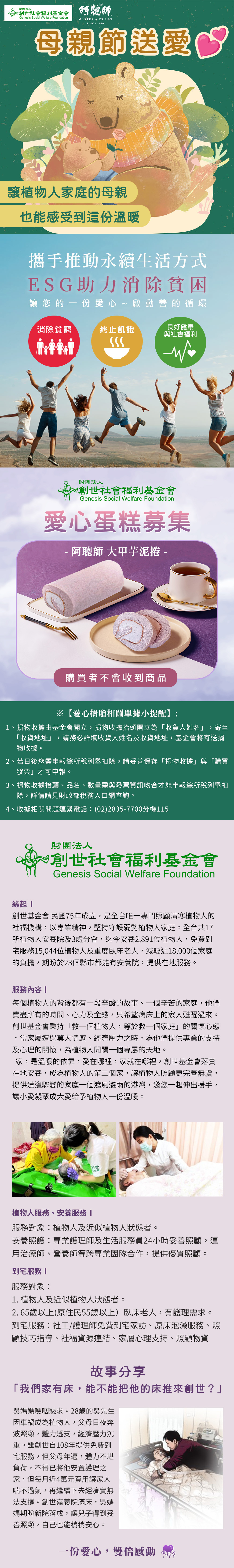 商品介紹*購買者不會收到商品*認購救助弱勢植物人家庭*飽滿濃厚的內餡*搭配著綿柔的芋頭蛋糕*勸募字號:衛部救字第1141365055號