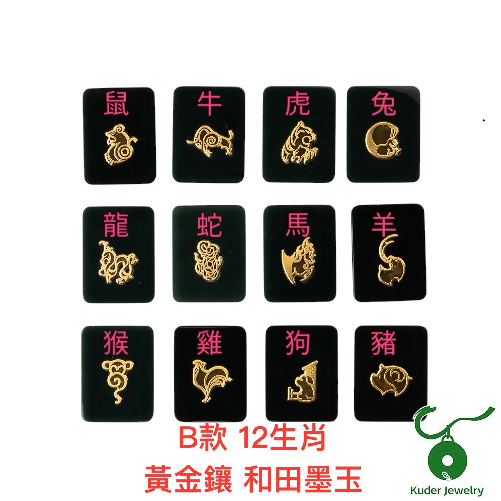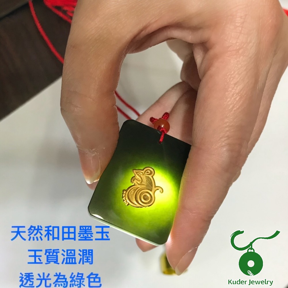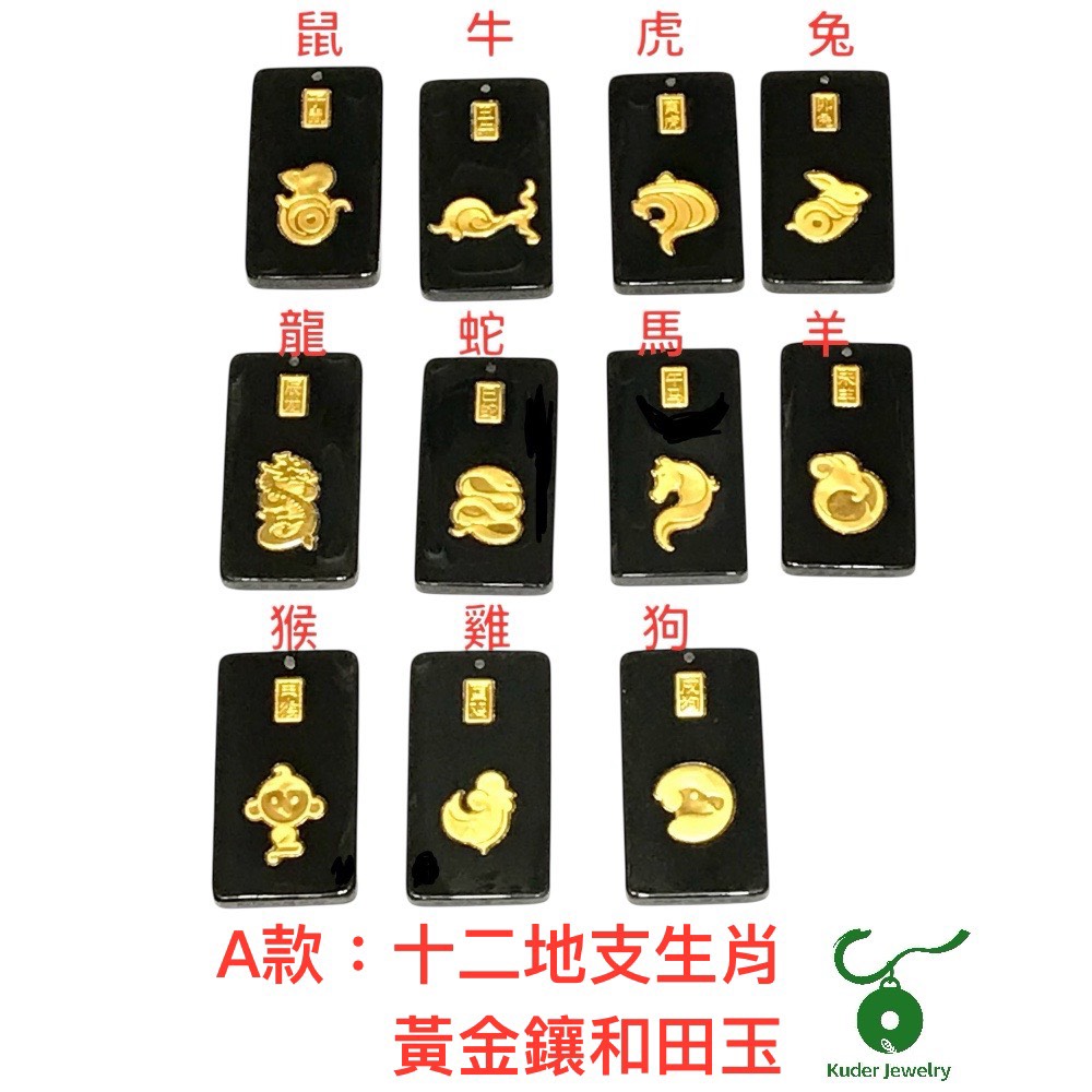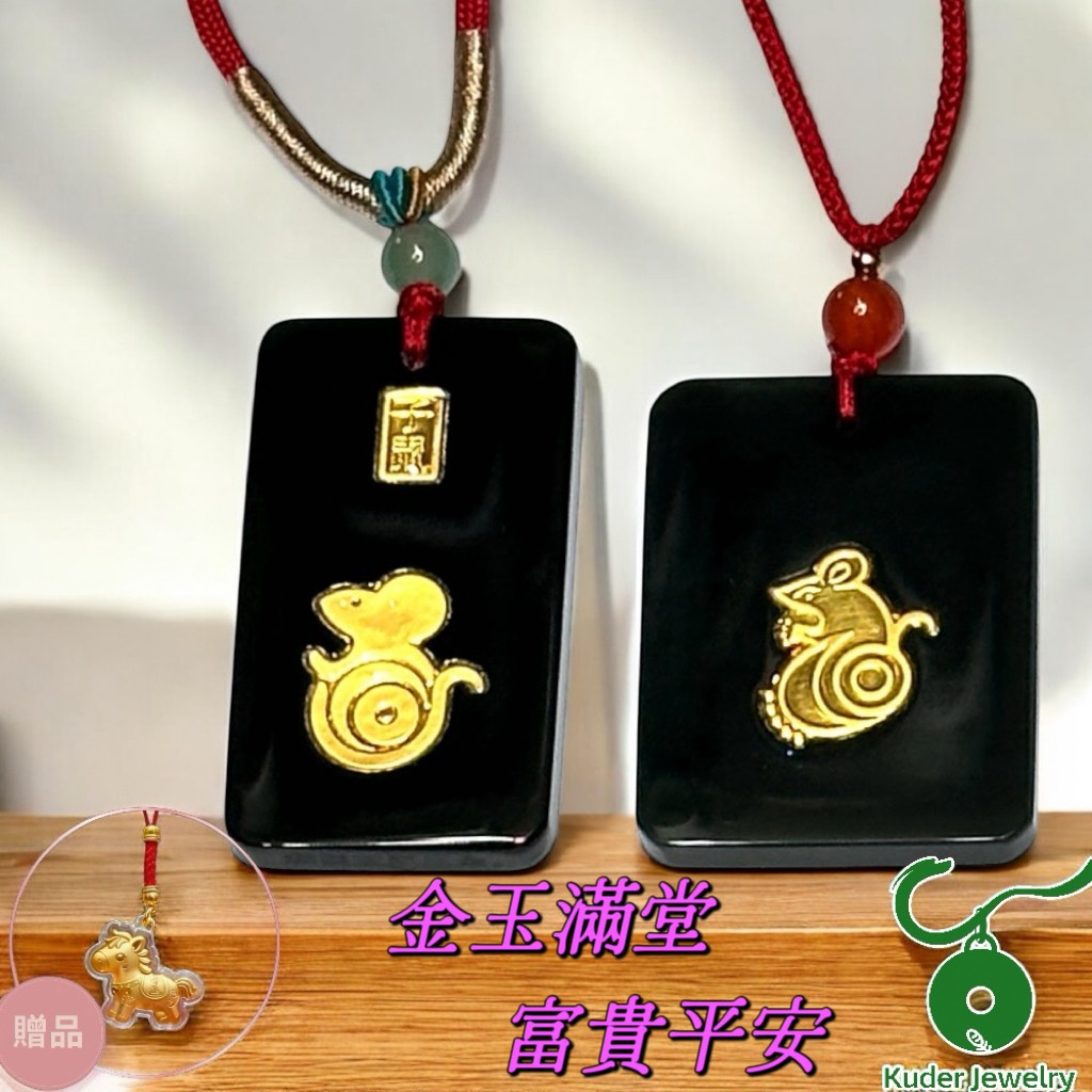 [快速出貨]Kuder Jewelry 999純金/黃金鑲天然和田墨玉(軟玉)生肖玉牌(男女適用)/兩款可選, 買任一件送一件小金馬吊飾